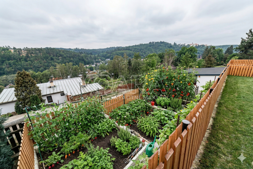 Zahradu navrhl zahradní architekt pro radost i užitek. Najdete zde nový trávník, ovocné stromy, záhony a skleník pro bio zeleninu. K tomu zděný zahradní domek vhodný jako dílna či letní kuchyně.