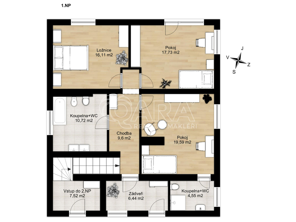 Patro: Tři prosvětlené pokoje, dvě koupelny a hala.