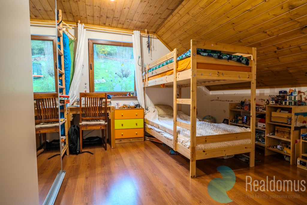 Dispozice 4+kk působí vzdušně a útulně zároveň. Velká okna vpouštějí dovnitř denní světlo a propojují interiér se zahradou, kde rostou ovocné stromy a kde najdete dvě terasy i balkon s výhledem, který se prostě neokouká.