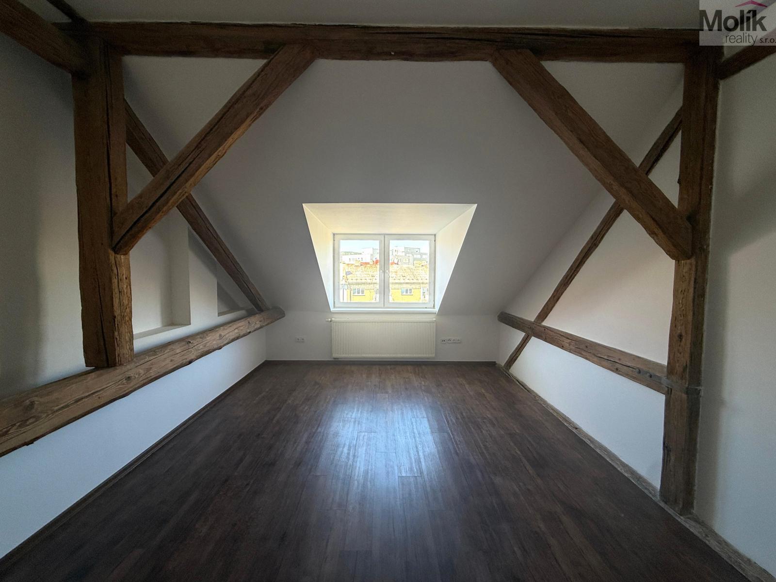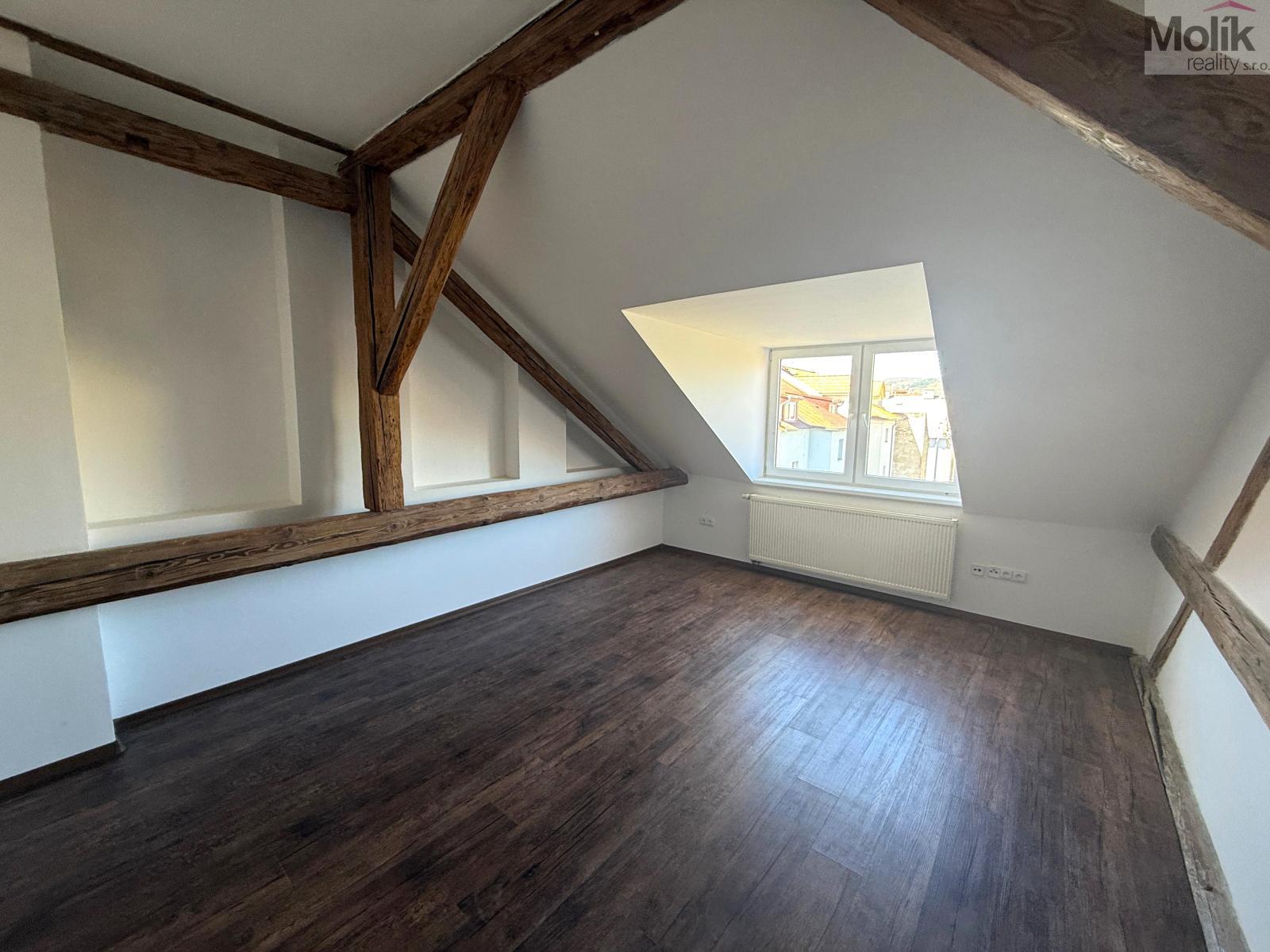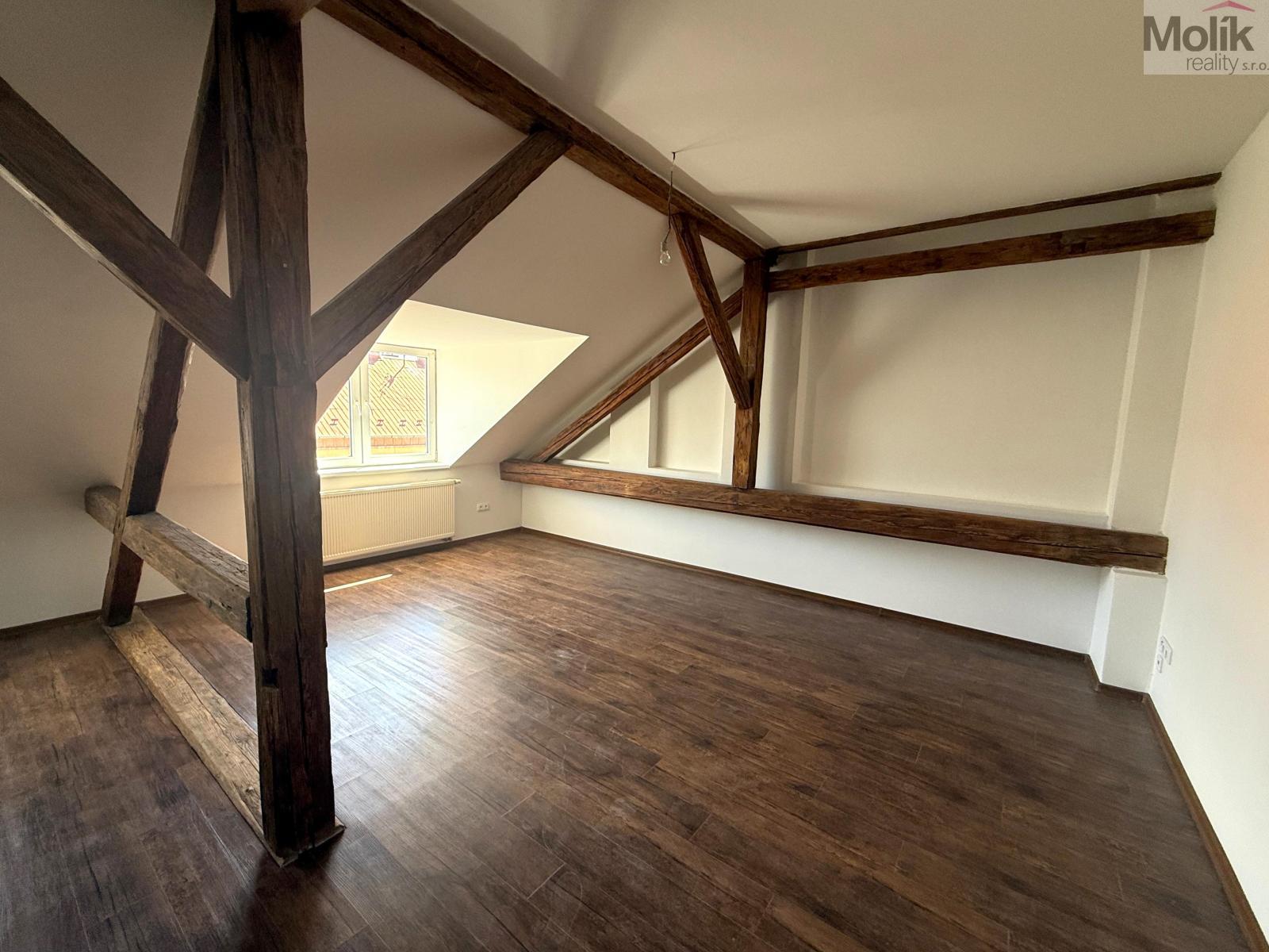 Nabízíme k pronájmu atraktivní, nově zrekonstruovaný byt o dispozici 3+kk a celkové výměře 72m and sup2; v podkroví cihlového domu situovaný v centru města Chomutov.