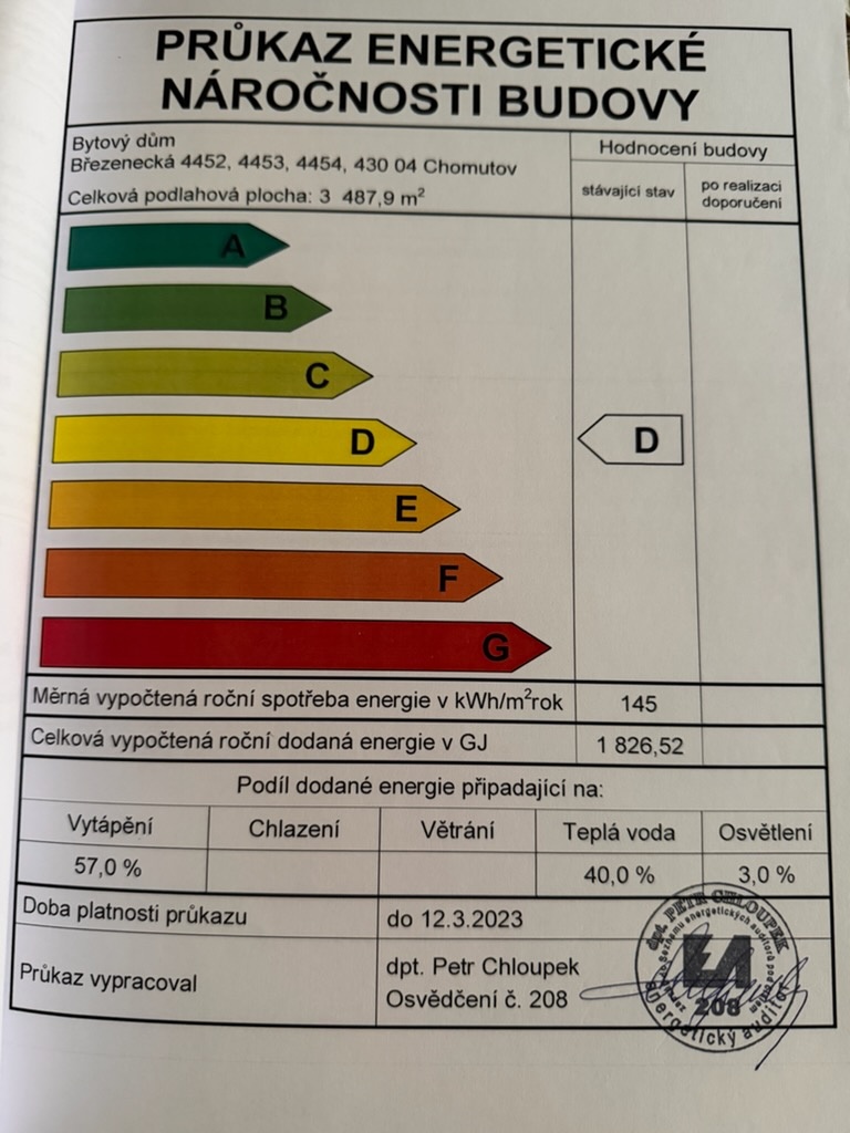 Dům působí velmi slušným dojmem, je obýván spořádanými rezidenty a je ve velmi dobrém technickém stavu. Objekt je zateplen, má plastová okna, moderní výtah, čisté a průběžně udržované společné prostory. Energetická náročnost budovy D.