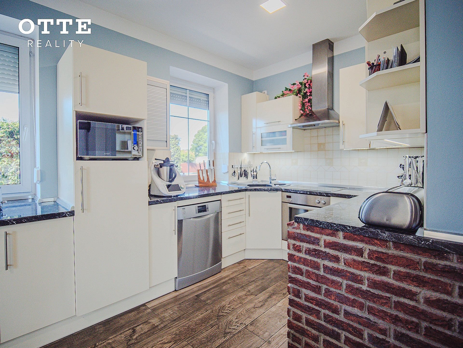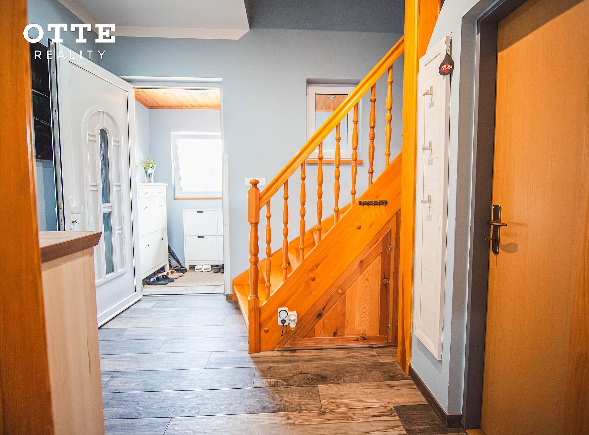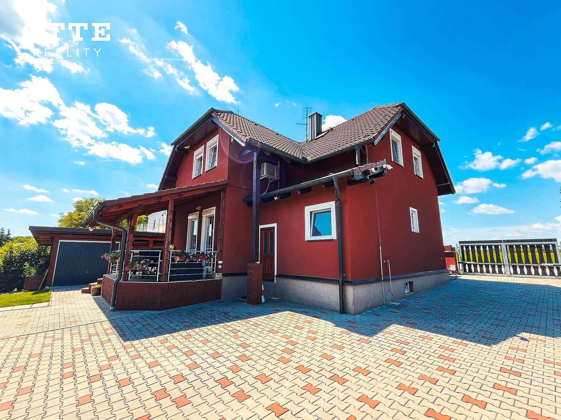 Rodinný dům má prakticky řešenou dispozici. Užitná plocha domu činí cca 132 m2. V přízemí se nachází předsíň, vstupní hala, prostorný obývací pokoj s jídelnou, kuchyňským koutem a se vstupem na terasu a zahradu. Dále koupelna se sprchovým koutem a samostatná toaleta. Předností obývacího pokoje, který má společně s jídelnou a kuchyňským koutem cca 50 m2 je nejen skutečnost, že díky několika oknům a vstupu na terasu je prostor velmi vzdušný a prosvětlený, ale také jsou v obývacím prostoru umístěná krbová kamna, která nabízí uživatelům domu velmi útulné prostředí a bydlení. Kuchyňská linka, která je vybavena vestavěnými spotřebiči varnou deskou, myčkou atd. V prvním patře je ložnice s výhledem do zahrady, pokoj, pracovna a prostorná koupelna se sprchovým koutem a toaletou. Ložnice je klimatizovaná v oknech jsou předokenní rolety. Dům je částečně podsklepený.