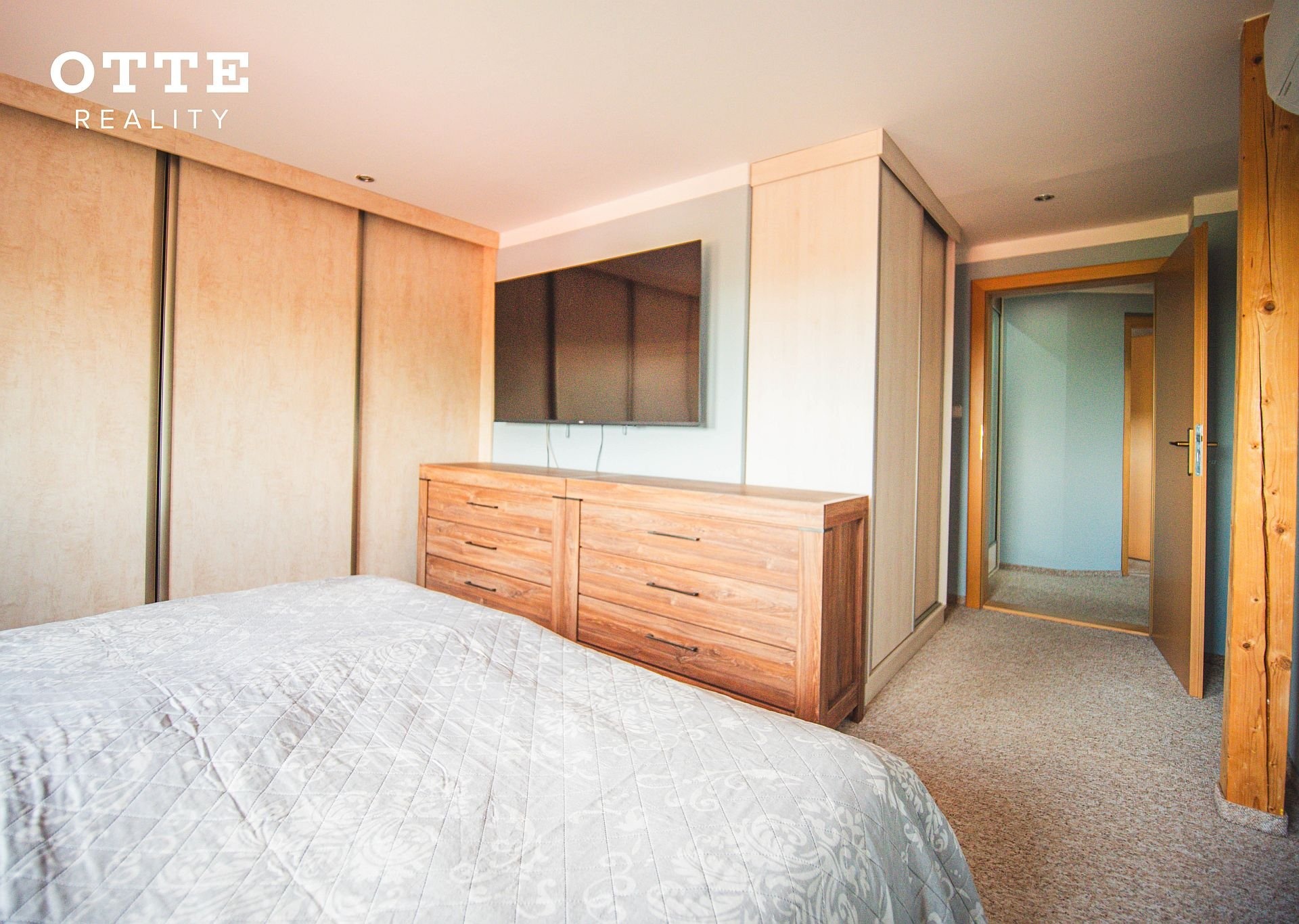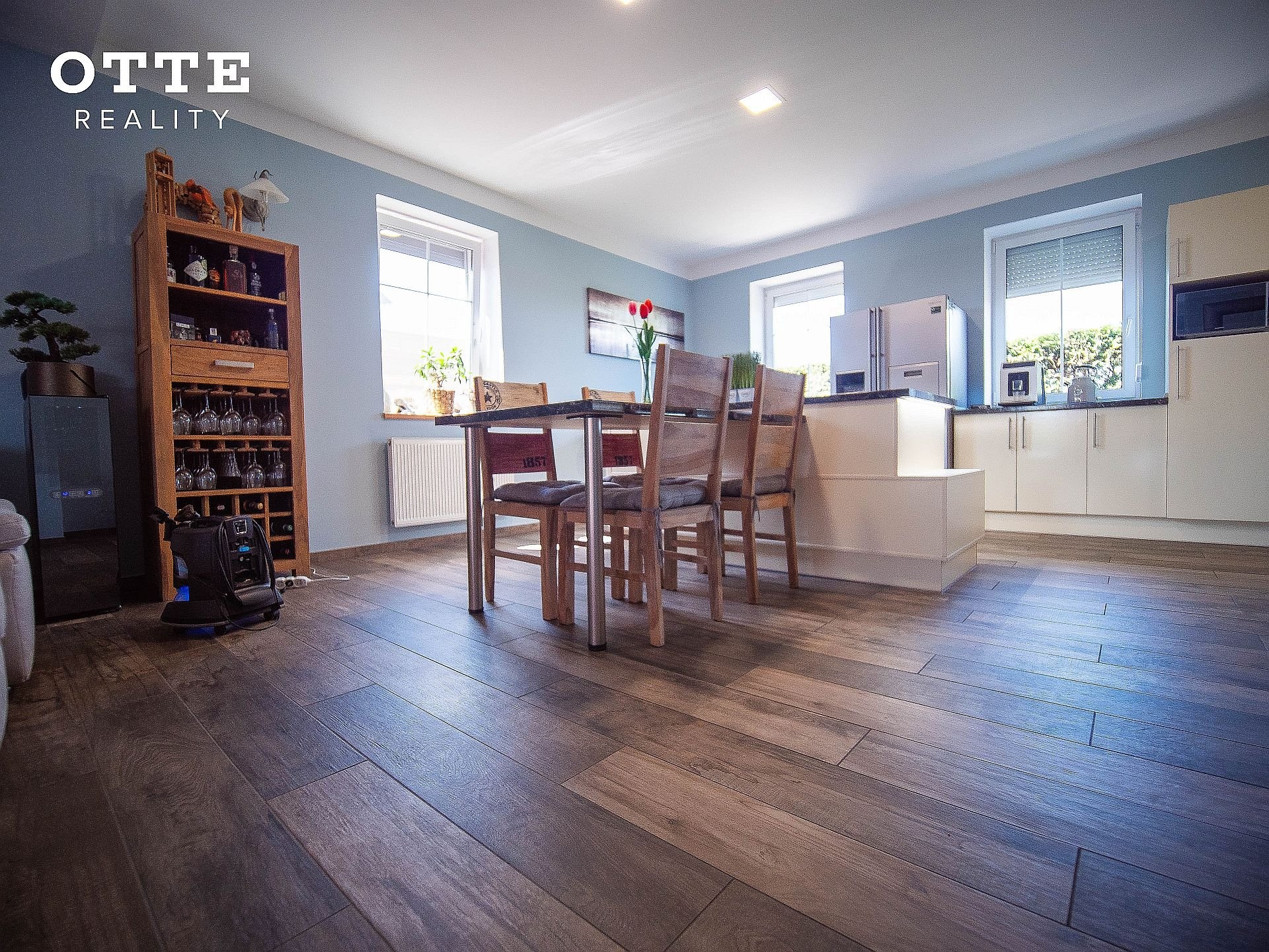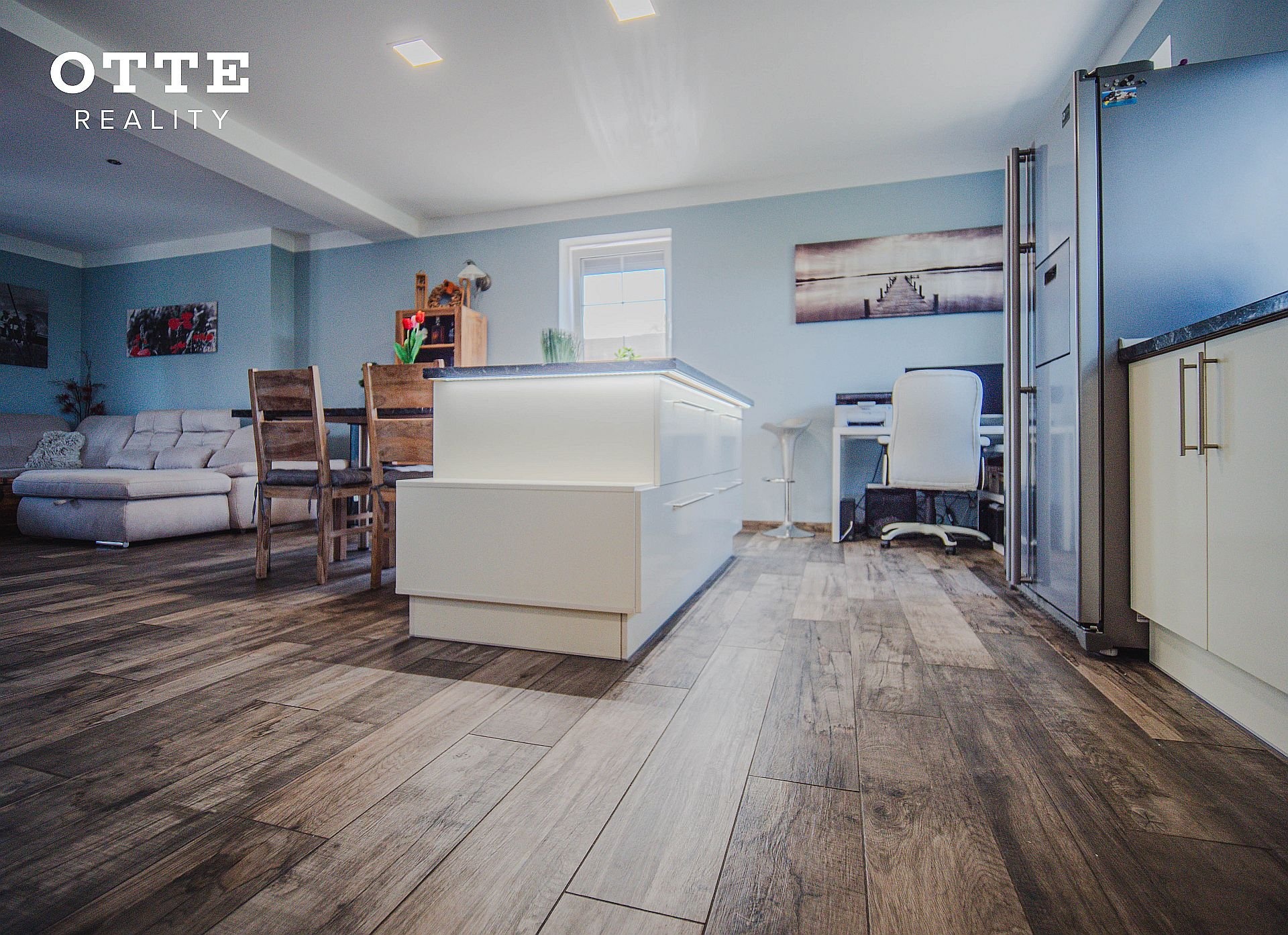 Rodinný dům má prakticky řešenou dispozici. Užitná plocha domu činí cca 132 m2. V přízemí se nachází předsíň, vstupní hala, prostorný obývací pokoj s jídelnou, kuchyňským koutem a se vstupem na terasu a zahradu. Dále koupelna se sprchovým koutem a samostatná toaleta. Předností obývacího pokoje, který má společně s jídelnou a kuchyňským koutem cca 50 m2 je nejen skutečnost, že díky několika oknům a vstupu na terasu je prostor velmi vzdušný a prosvětlený, ale také jsou v obývacím prostoru umístěná krbová kamna, která nabízí uživatelům domu velmi útulné prostředí a bydlení. Kuchyňská linka, která je vybavena vestavěnými spotřebiči varnou deskou, myčkou atd. V prvním patře je ložnice s výhledem do zahrady, pokoj, pracovna a prostorná koupelna se sprchovým koutem a toaletou. Ložnice je klimatizovaná v oknech jsou předokenní rolety. Dům je částečně podsklepený.