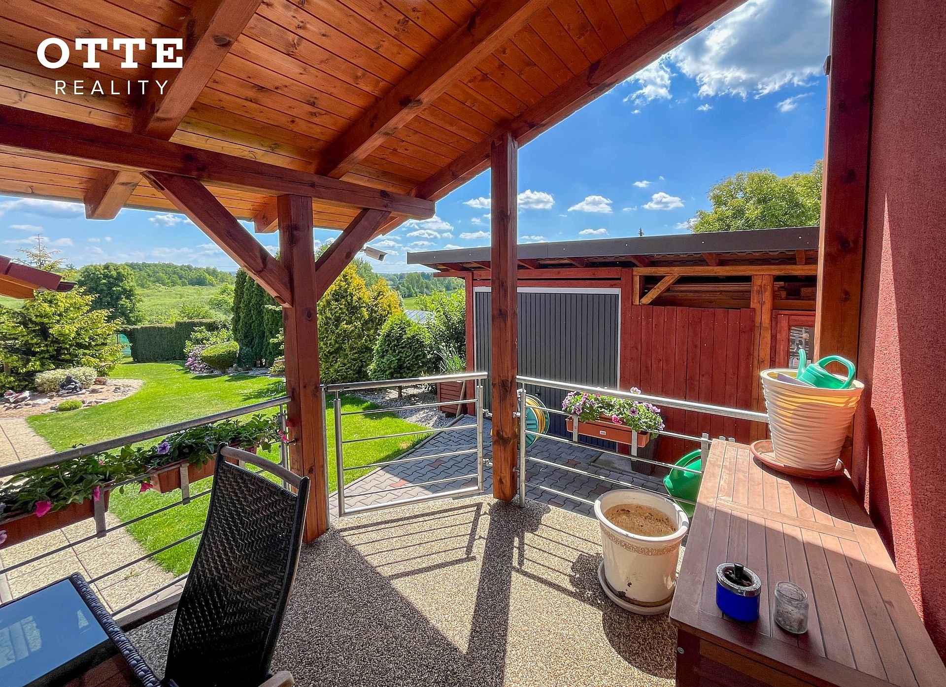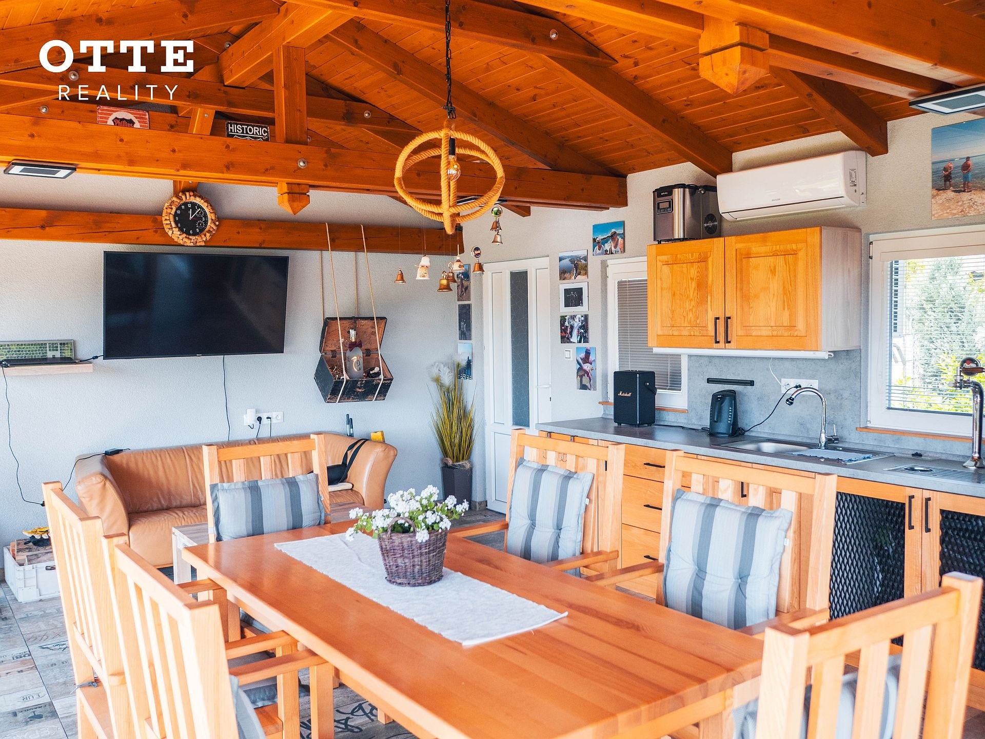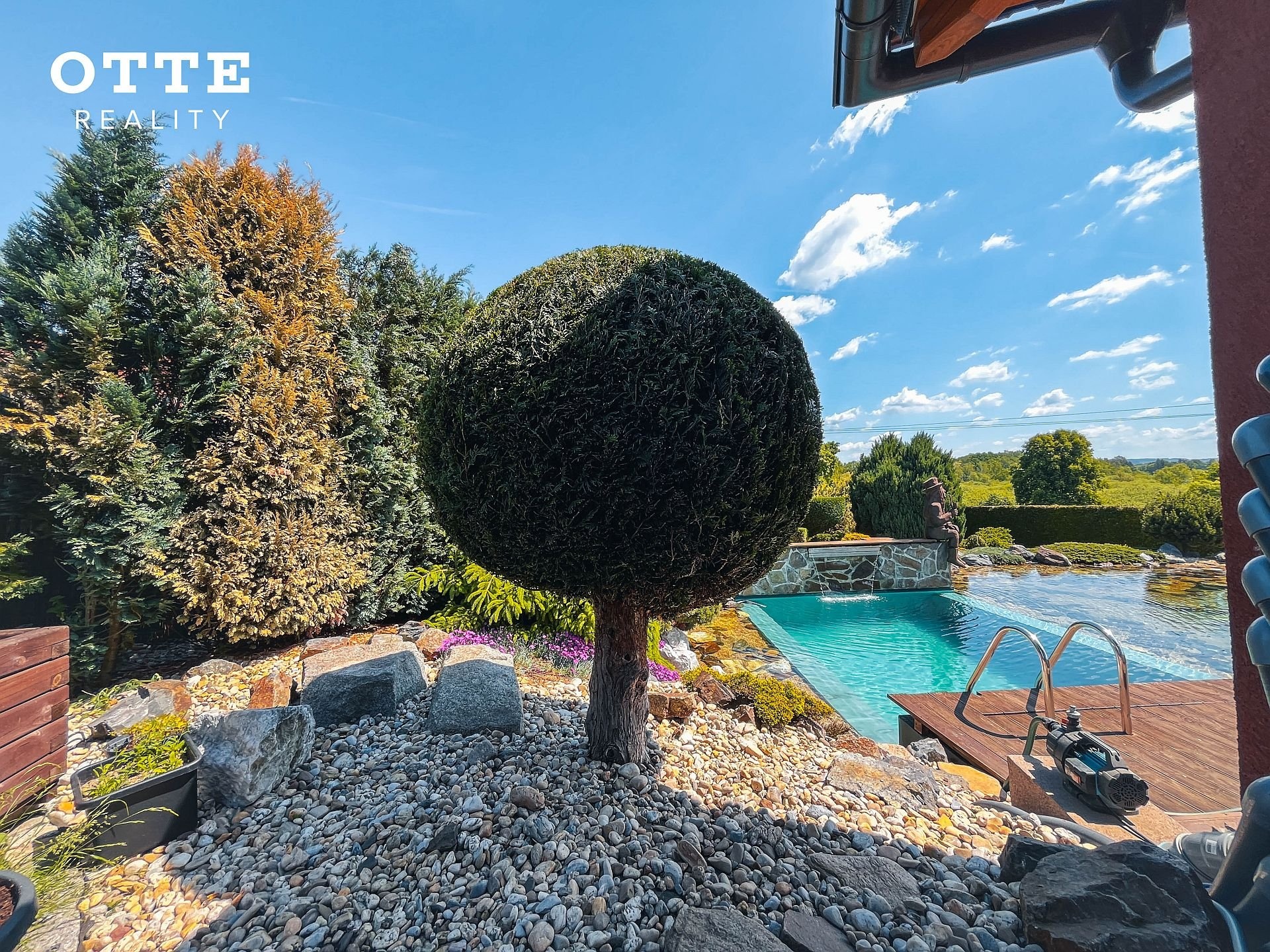 Nadstandardem jsou krbová kamna v obývacím pokoji, dvě koupelny a také venkovní bazén a jezírko. Místo, které Vás ovšem zcela jistě nadchne je zastřešená venkovní letní kuchyně s krbovými kamny, velkým stolem pro několik osob. Místo, které je jako stvořené pro odpočinek, relaxaci a trávení většiny Vašeho volného času na zahradě. S přáteli posedět pod obrovskou zastřešenou pergolou s krbem nebo si jen vychutnávat klid s rodinou. Díky orientaci na jižní stranu je v této části zahrady dostatek sluníčka pro opalování a využívání bazénu. Tento dům Vám zpříjemní život a utvoří domov.