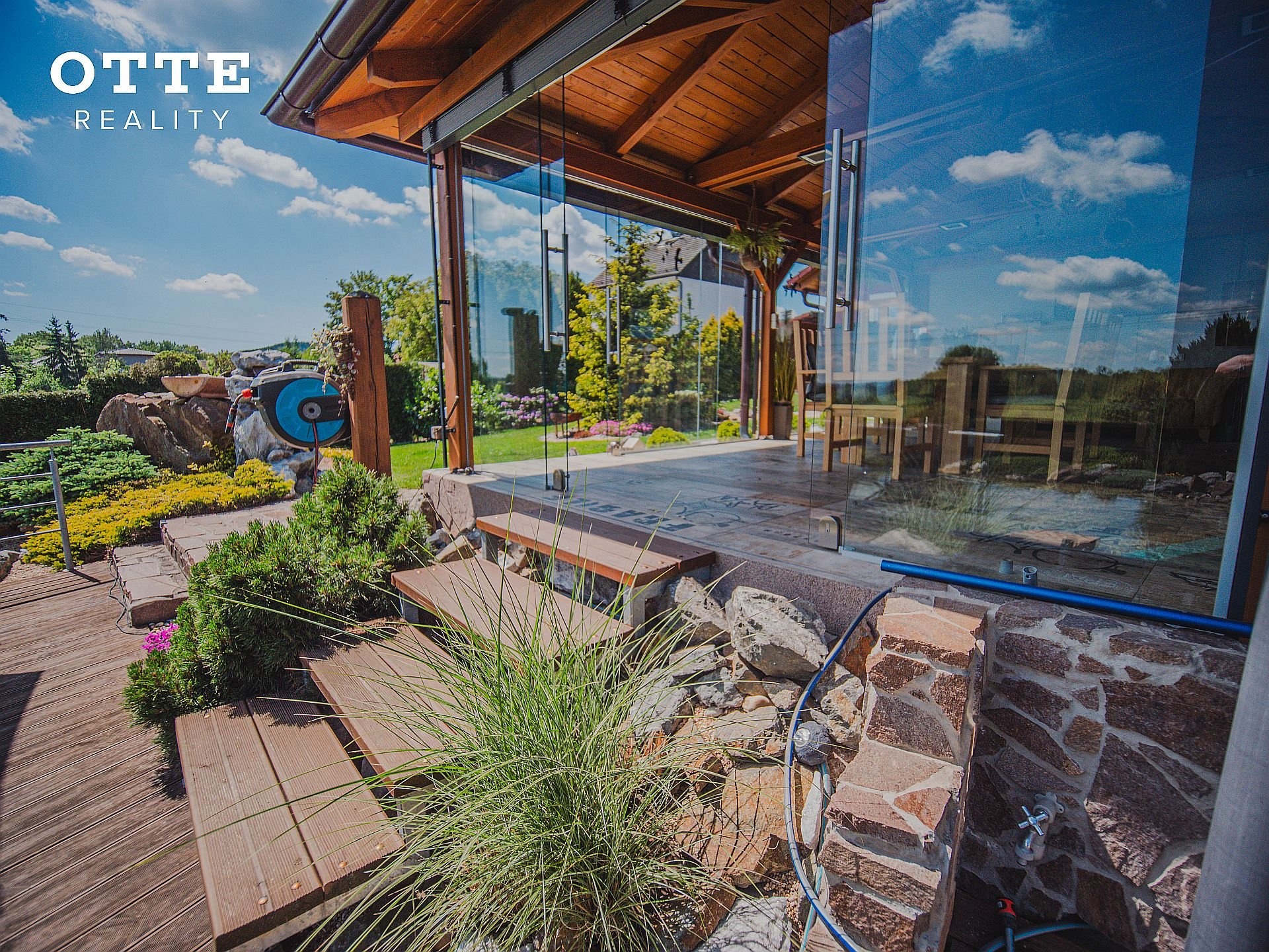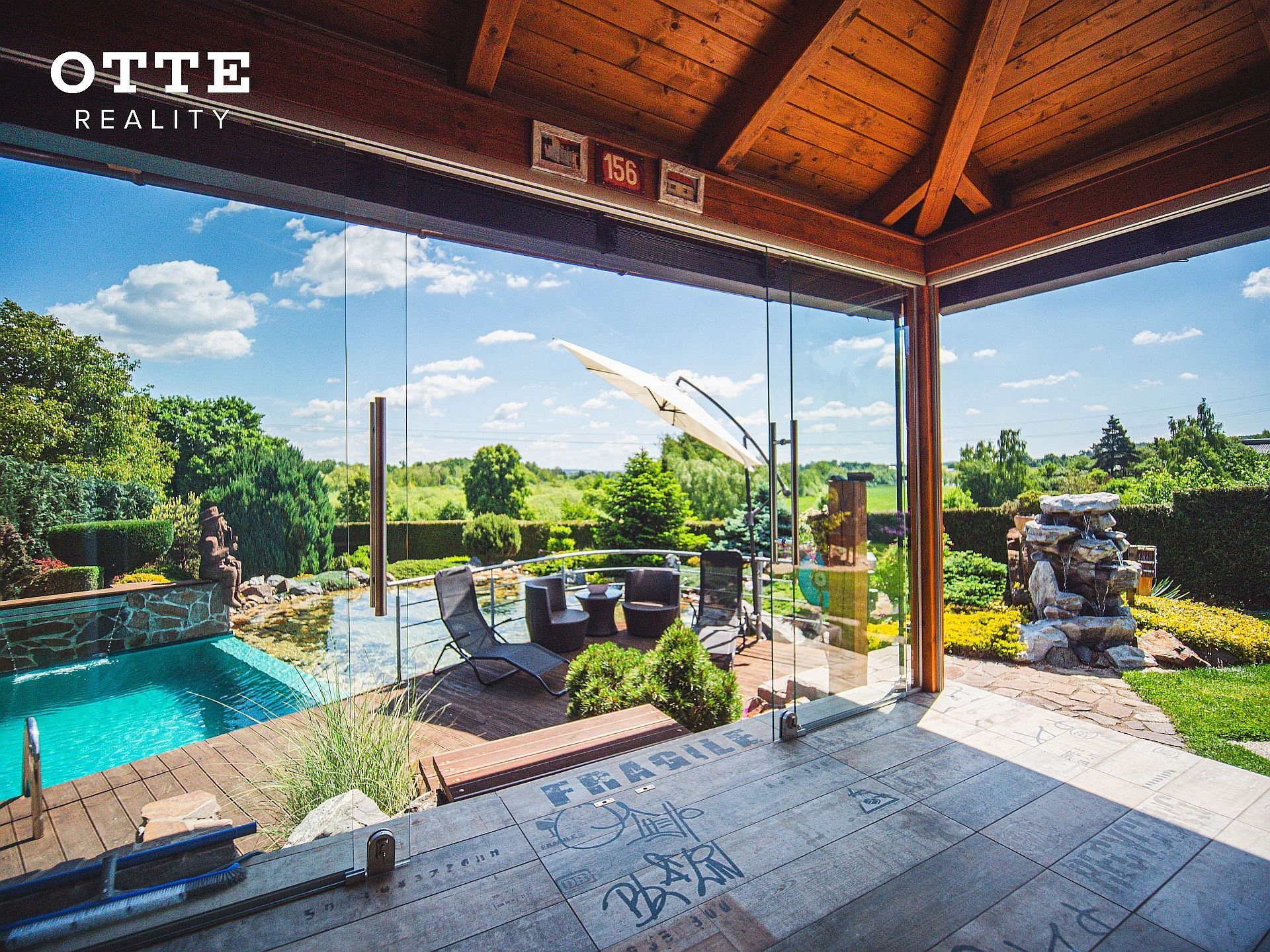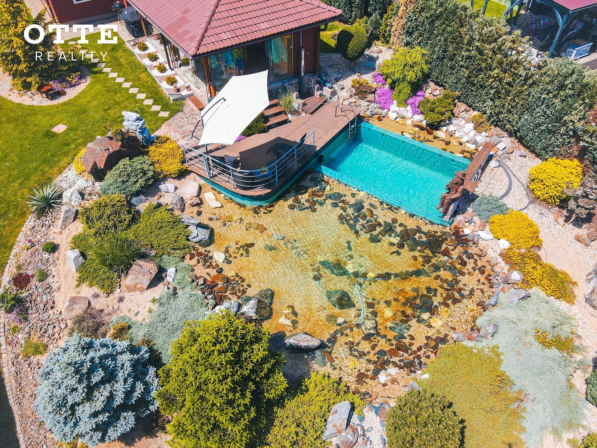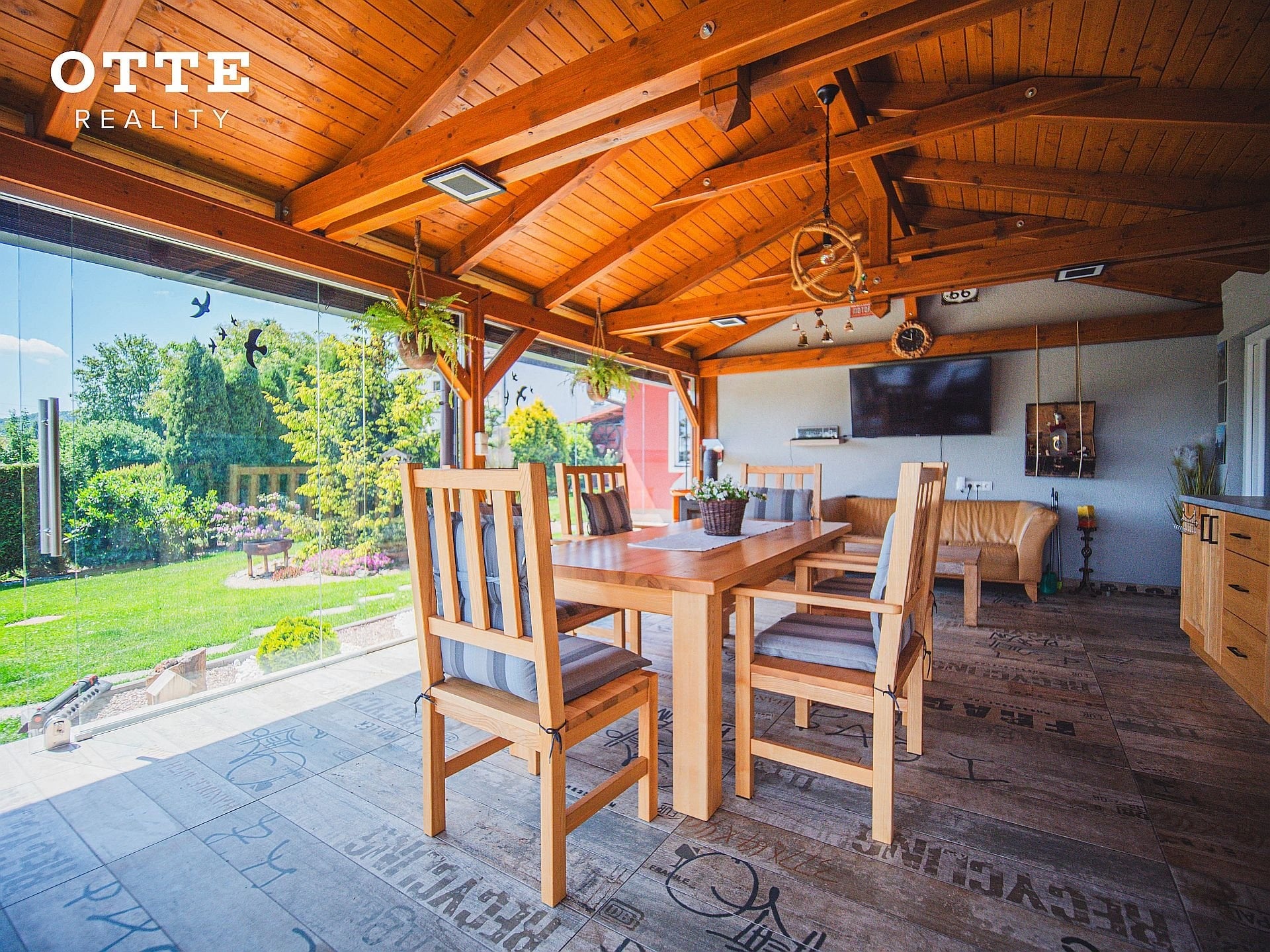 Rodinný dům s bazénem, rybníčkem i obrovskou zastřešenou pergolou vybavenou krbem i kuchyňskou linko