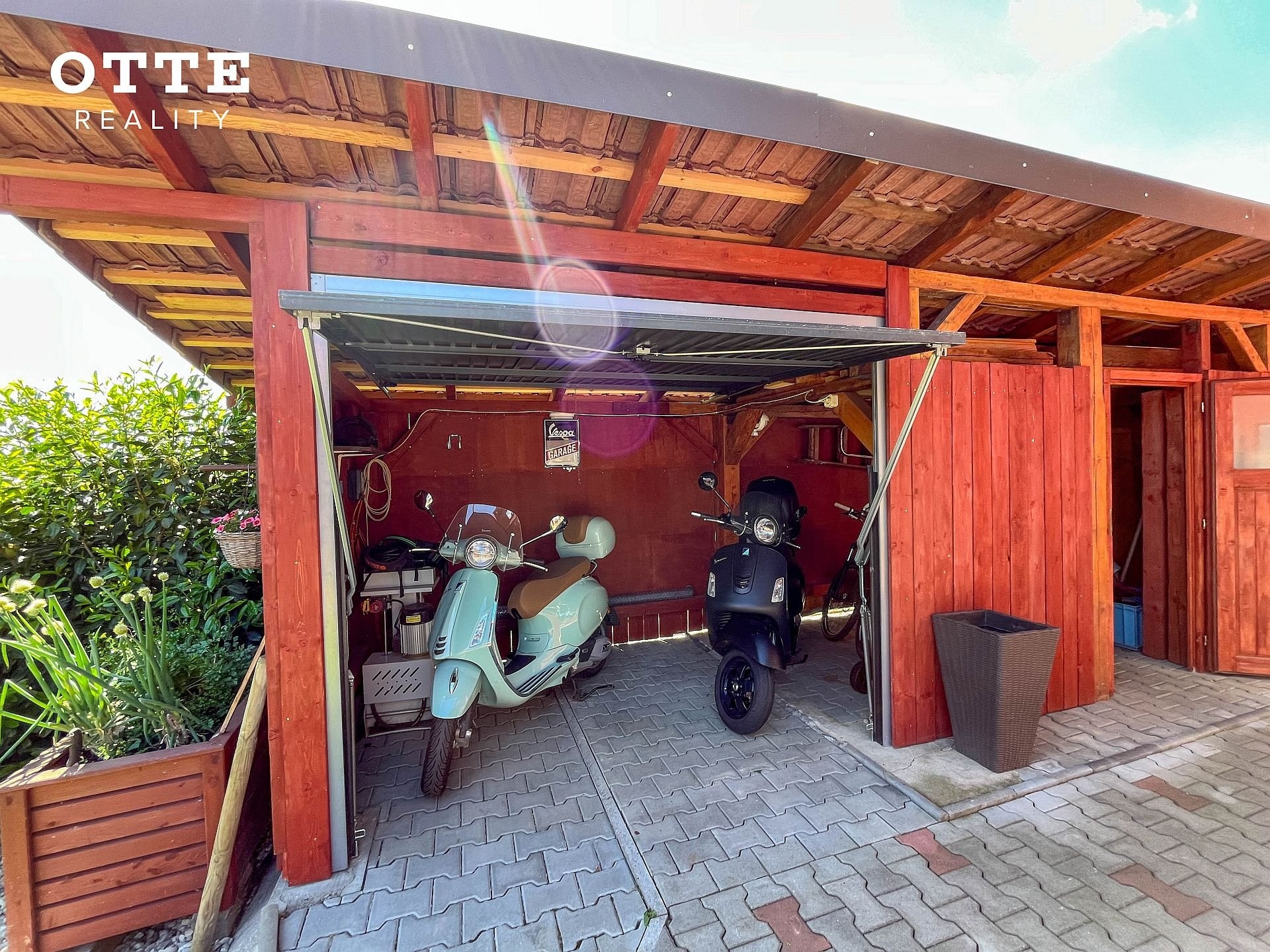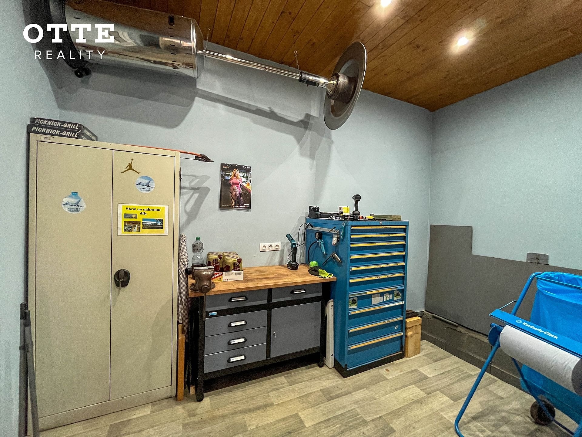 Na zahradě je prostorná samostatně stojící garáž s půdním úložným prostorem, na kterou navazuje dílna a sklad zahradního nářadí. Tato část je také částečně podsklepená. Tento sklepní prostor by byl vhodný např. pro zřízení vinotéky.