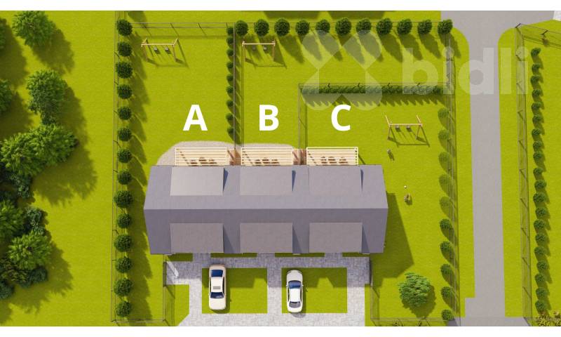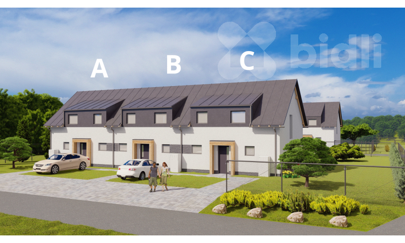 Byt (C) je součástí trojdomu, a díky vlastní zahradě, terase a dvěma parkovacím místům nabízí plnohodnotný komfort srovnatelný s bydlením v rodinném domě. K dispozici je navíc i dobíjecí stanice pro elektromobil.