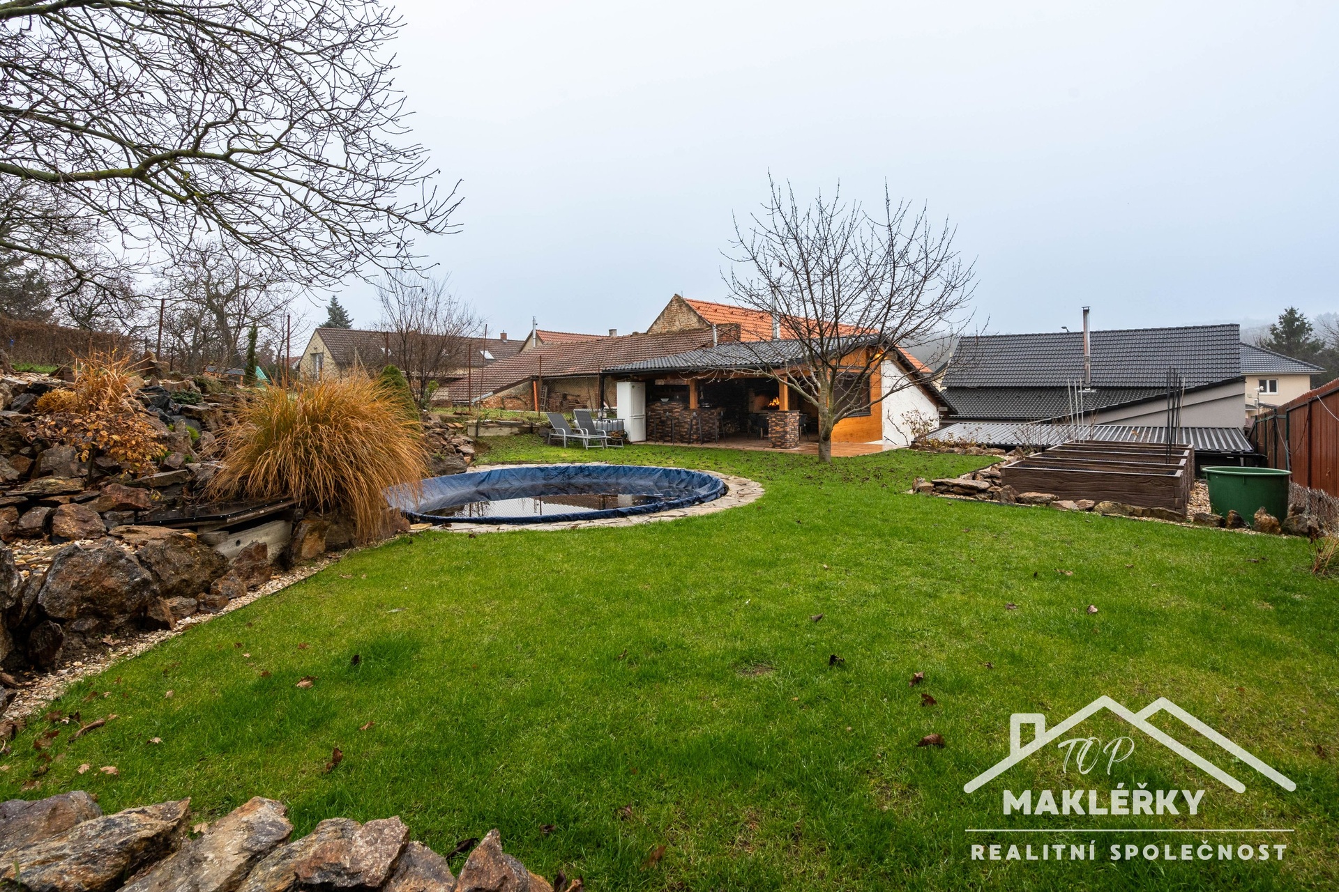 V letních měsících oceníte naprosto unikátní zastřešenou a ze tří stran uzavřenou letní kuchyni - dokončena v srpnu 2025. Pro uplatnění kuchařských kvalit je zde připraven gril, poctivá pec s pláty na vaření, udírna a samozřejmě nechybí prostorný krb. Nádobí opláchnete v granitovém dřezu vodou přivedenou z obecního vodovodu. V parních letních měsících využijete i zapuštěný kruhový bazén o objemu 20 m³. A kdyby bylo snad chladněji, je připraven solární ohřev.