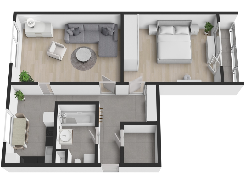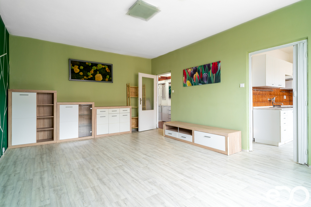 Dispozice se skládá z: prostorného a světlého obývacího pokoje, kuchyně, samostatné ložnice se vstupem na zasklenou lodžii (4,51 m²), koupelny s vanou a WC, komory a prostorné chodby. Celková plocha je 66 m². V suterénu domu najdete sklepní kóji o velikosti 2,20 m² a společnou kolárnu.