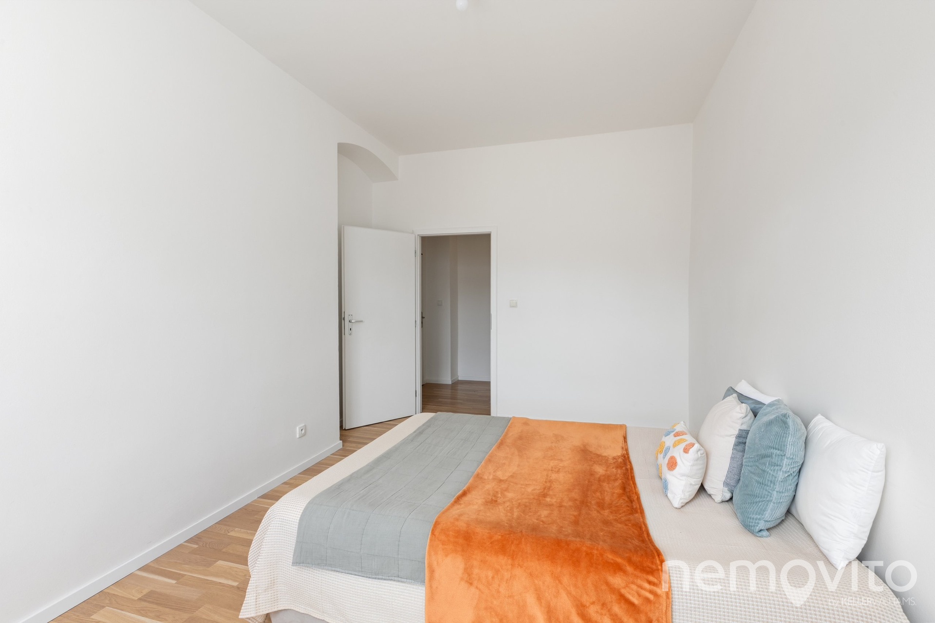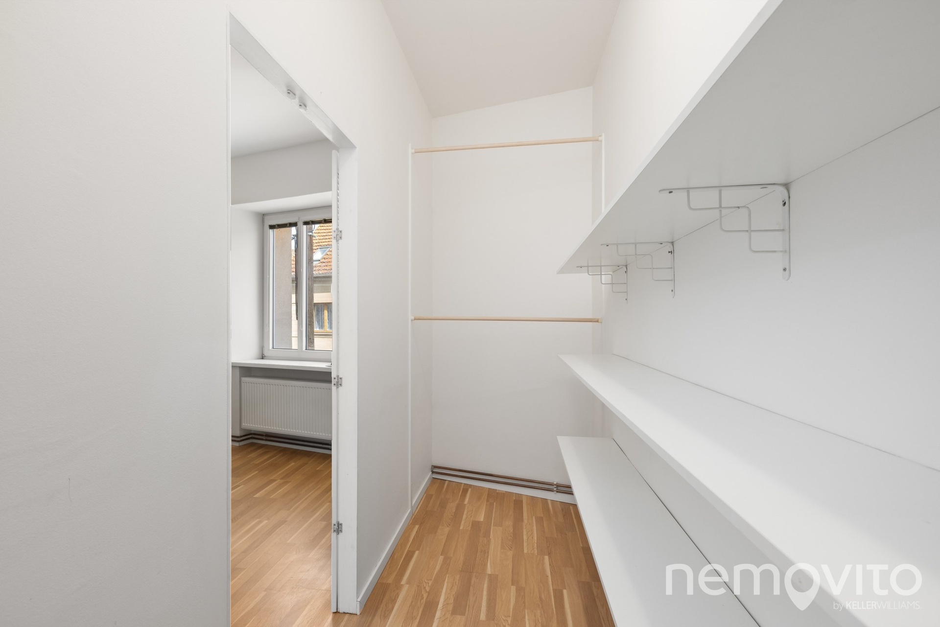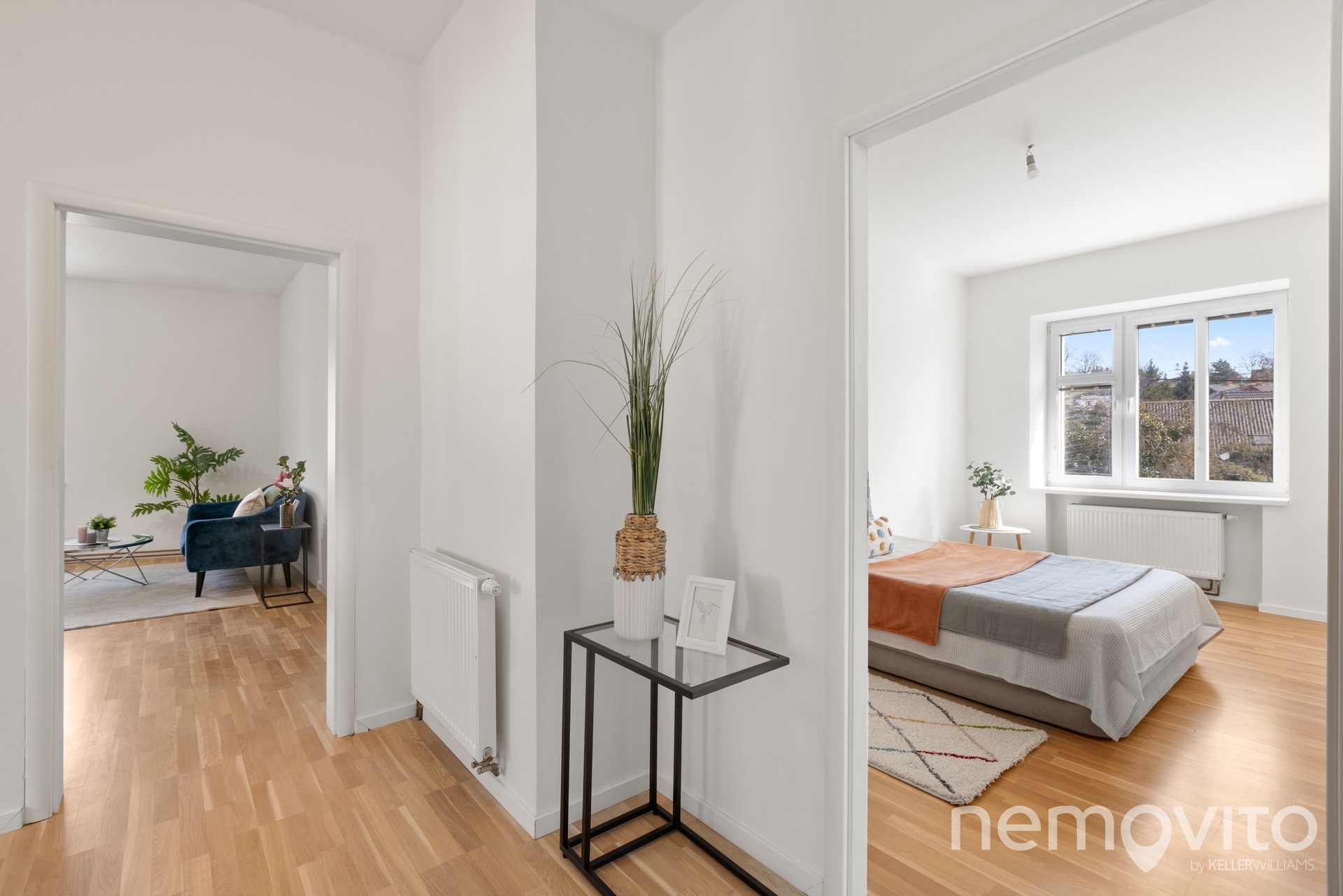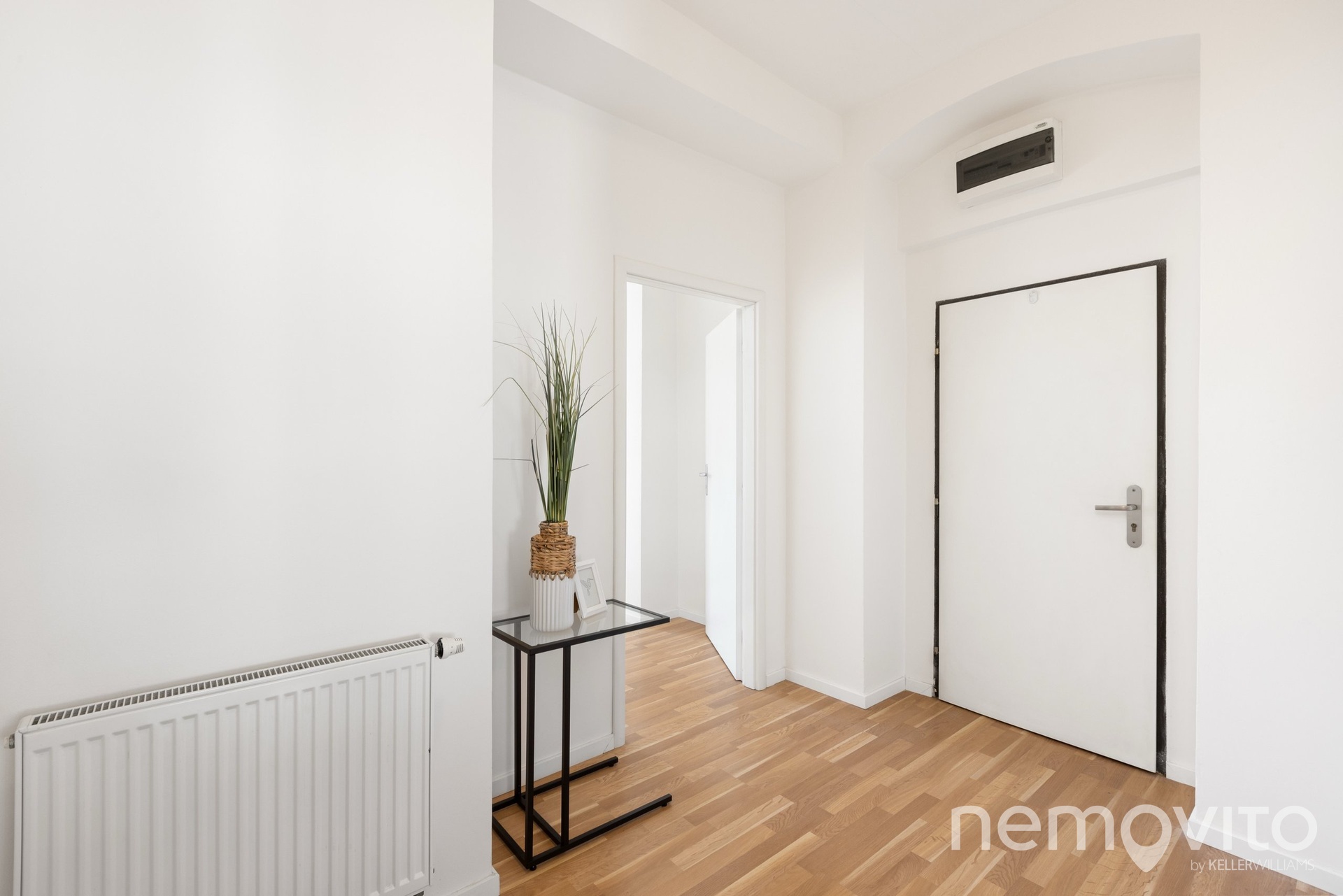 Kuchyňská linka je od obýváku oddělena polopříčkou, plocha pokoje je 28 m2, a prostor kuchyně i jídelny je tak velkorysý. Ložnice jsou dvě, přičemž ta větší má k dispozici také vlastní oddělenou šatnu (16 + 5 m2). Menší ložnice má 15 m2 a okno orientované na východní stranu. Koupelna a WC jsou samostatně. V pětimetrové koupelně je vana a místo na pračku a sušičku nad sebou.