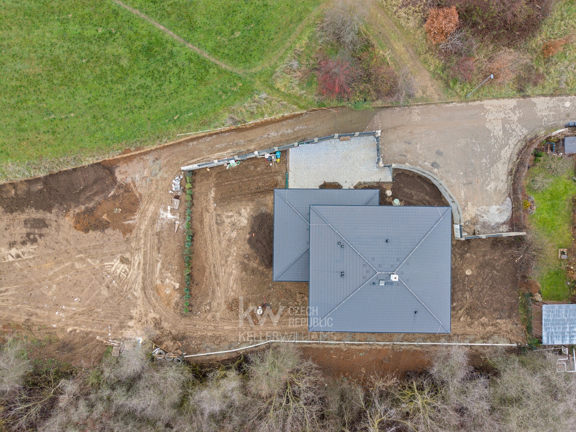 Exteriér počítá s dlažbou na příjezdu i vstupu, oplocením pozemku a elektrickou bránou. Všechny inženýrské sítě jsou k dispozici, příjezdová komunikace bude dokončena po uzavření stavebních prací. Zahradní úpravy, terasa nebo pergola je možné realizovat formou klientských změn.