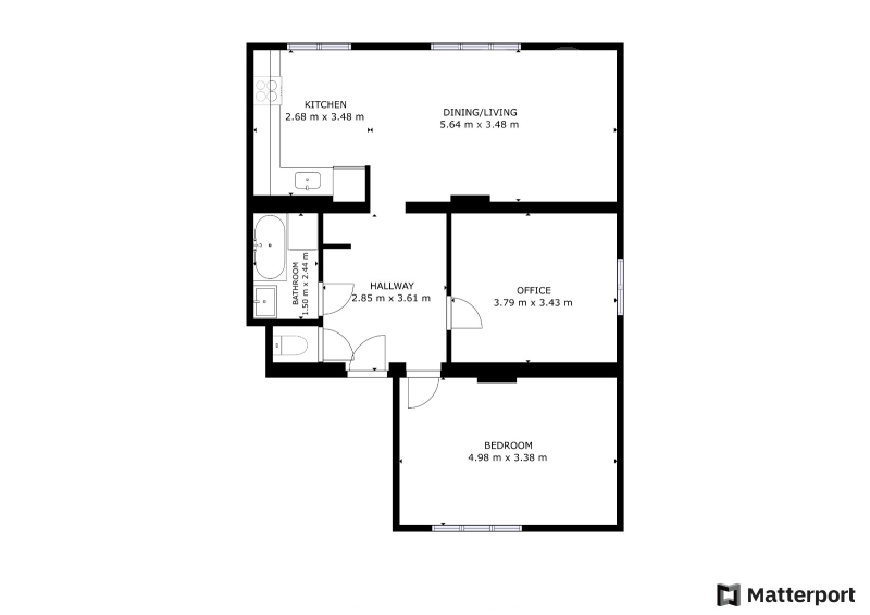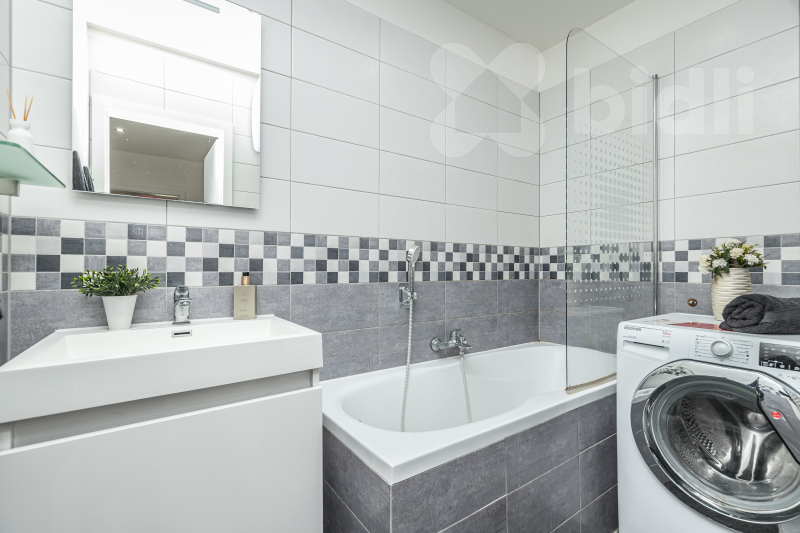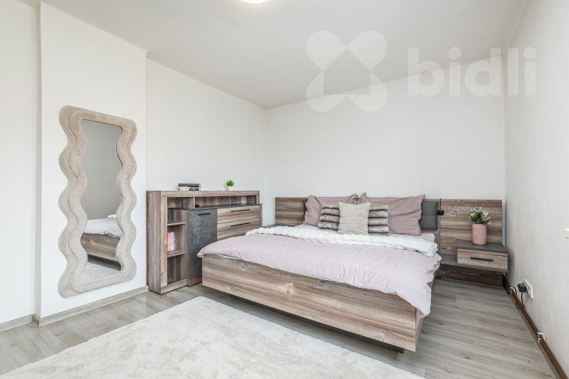 Dispozice bytu nabízí ideální rozložení prostoru: vstupní předsíň, obývací pokoj s kuchyňským koutem, ložnice, dětský pokoj (případně pracovna), koupelna s vanou a místem pro pračku a sušičku a samostatné WC. V obývacím pokoji je instalována klimatizační jednotka. Na podlahách je kombinace plovoucí podlahy a keramické dlažby, okna jsou plastová.