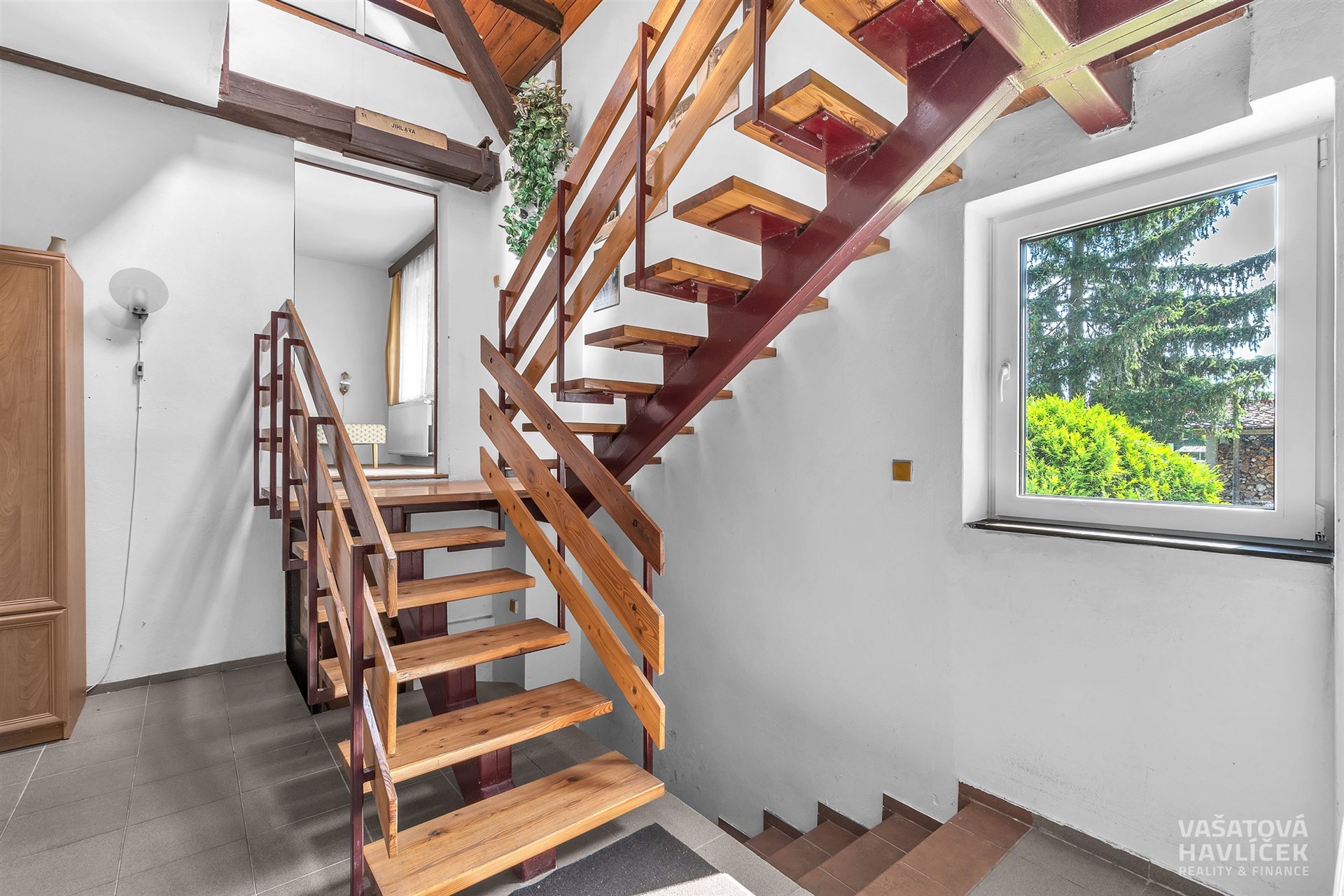 Dům má následující dispozici: přízemí – vstupní chodba, kuchyň s jídelnou, obývací pokoj s krbem, pracovna, komora, koupelna s vanou a sprchovým koutem, samostatné WC, chodba (plynový kotel, pračka); mezipatro – pokoj s lodžií (ze které se sejde na zahradu před dům); první patro – dva pokoje (přívod vody do každého pokoje), samostatné WC, 2x šatna, pěkný otevřený prostor s podiem.