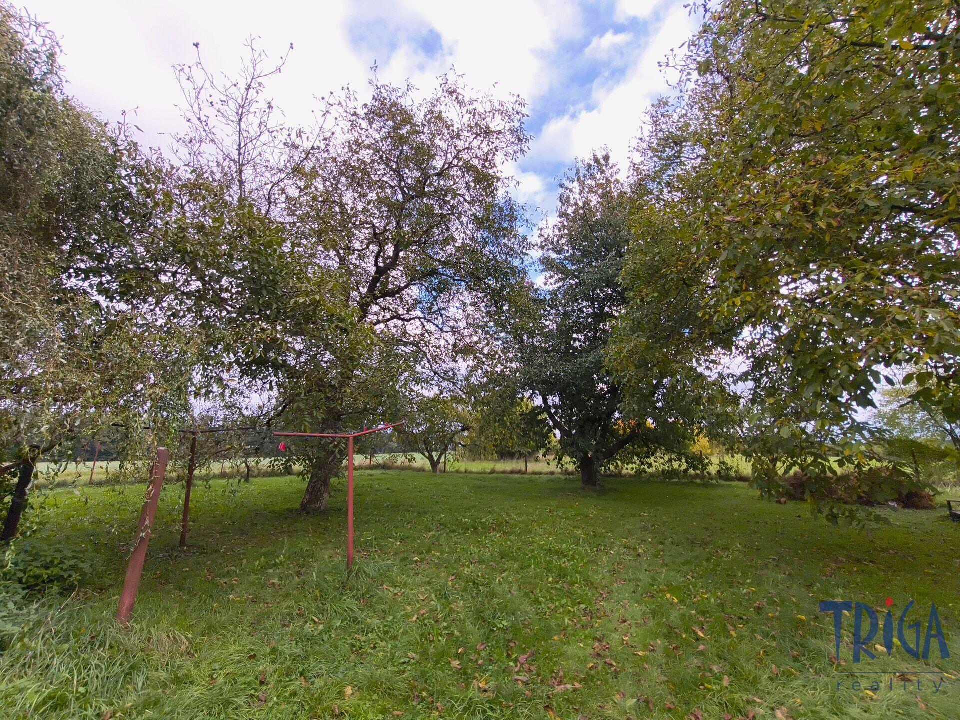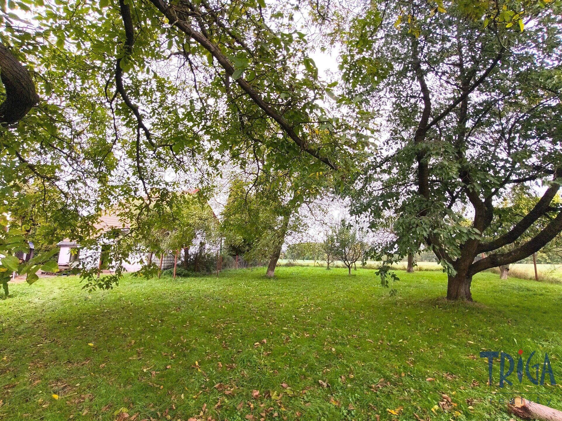 Na zahradě rostou vzrostlé ovocné stromy, ořešáky, lísky a směrem k jedinému sousedovi chrání soukromí řada tújí.
