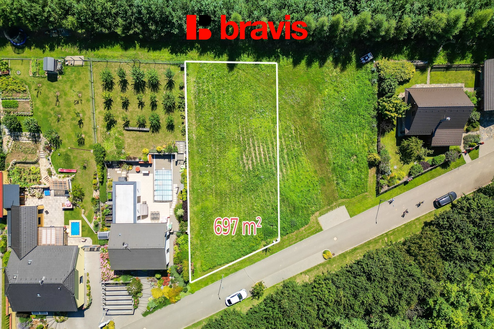 Pozemek je o výměře 697 m2 (šíře cca 17,5 m a v nejkratším místě je délka 36 m a v nejdelším cca 44 m) je rovinatý a neoplocený, vhodný pro výstavbu samostatně stojícího rodinného domu. Pozemek poskytuje dostatek soukromí a klid pro odpočinek i rodinné bydlení. Zastavitelnost pozemku je 35%.