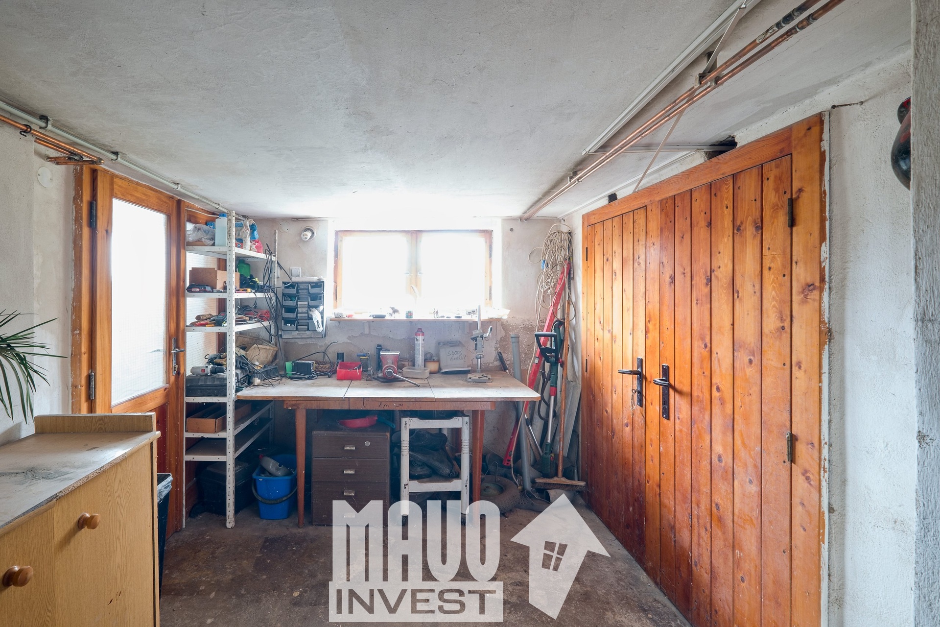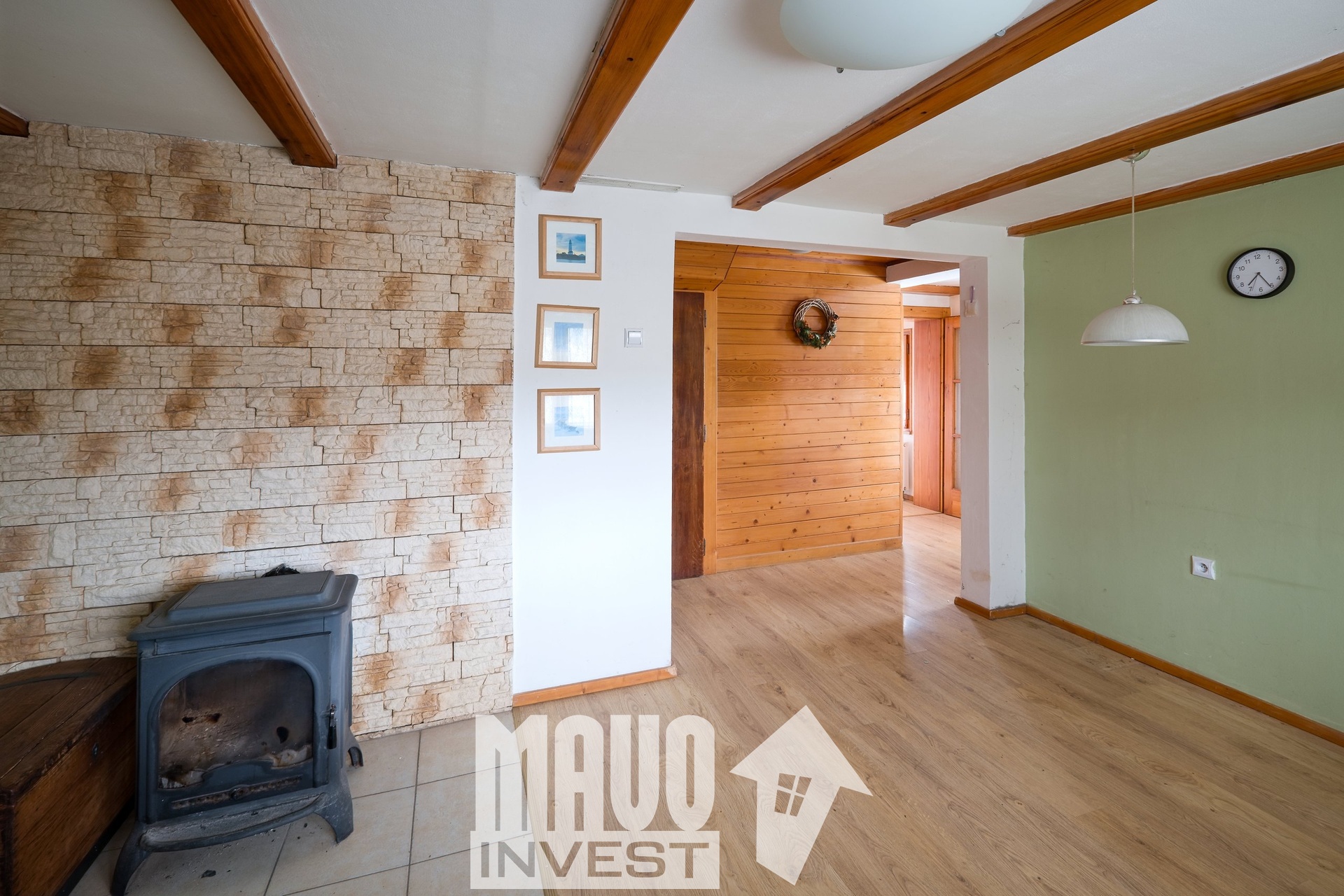 Obývací prostor s kamny nabízí příjemnou atmosféru. Kuchyň má praktické uspořádání a dostatek úložného prostoru. V podkroví se nachází ložnice. K dispozici jsou dvě koupelny, jedna se sprchovým koutem, druhá s vanou. Nechybí ani technické zázemí a dílna pro kutily.