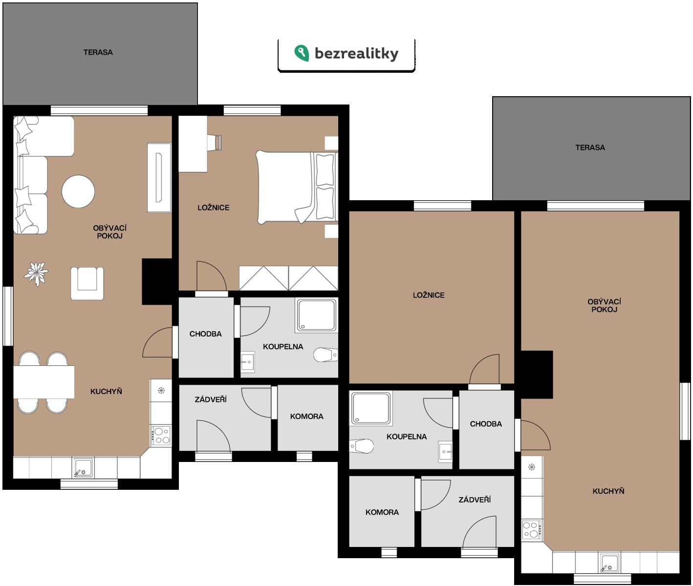 Jedna z jednotek je plně vybavená a toto vybavení je součástí kupní ceny. V případě, že by novému majiteli nevyhovovalo, je možné jej demontovat. Druhá jednotka je ponechána bez vybavení, což umožňuje dokončení dle vlastního stylu nebo přizpůsobení cílové klientele při investičním záměru.