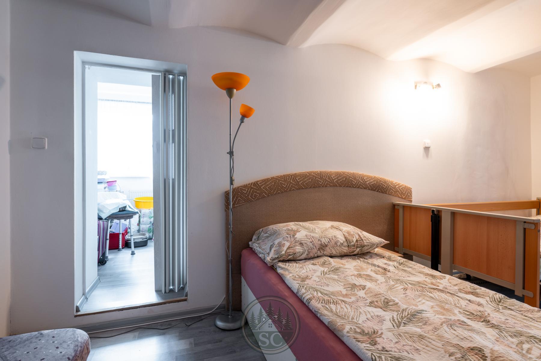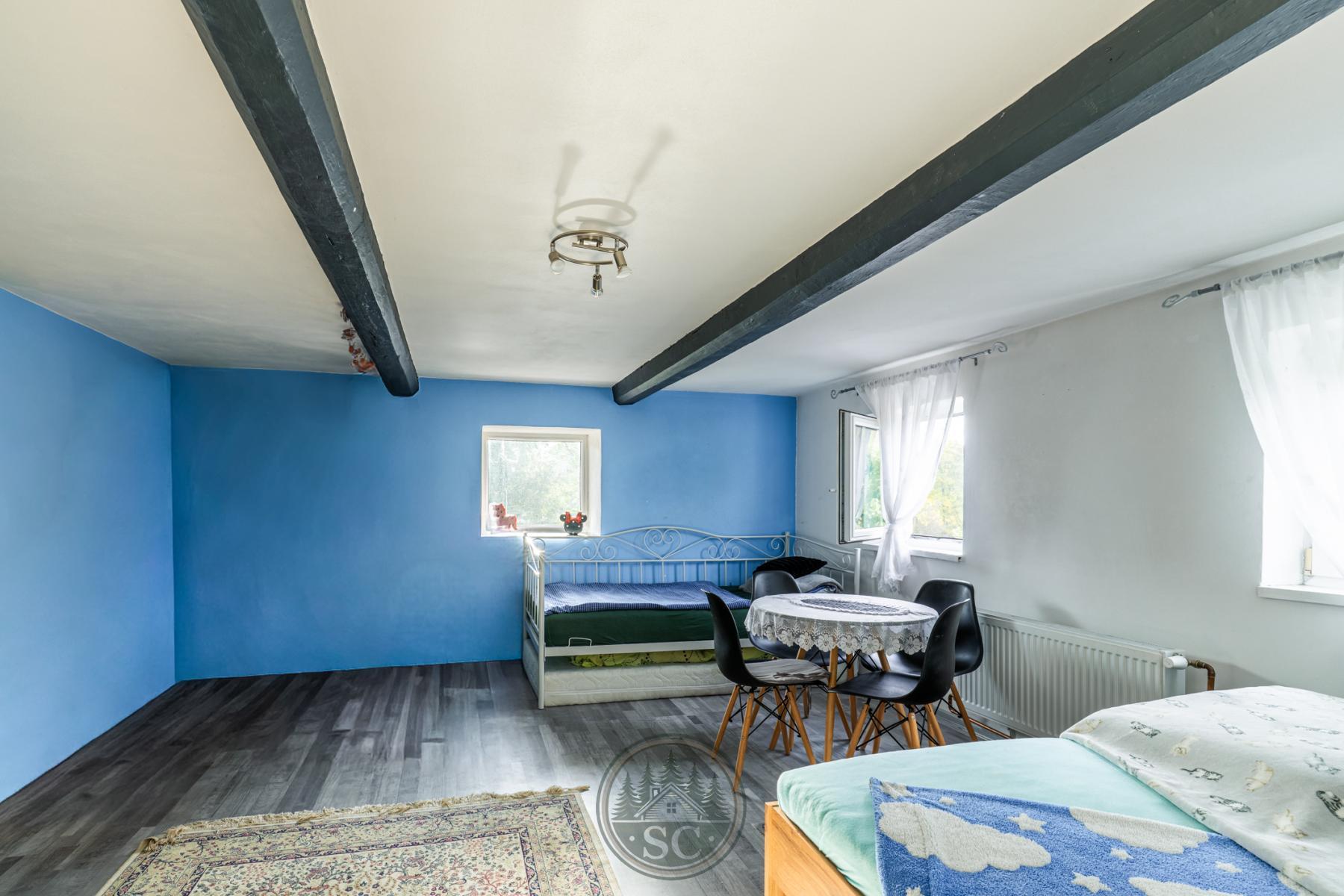 Dispozice domu je promyšlená a útulná. Vstupem se dostanete do předsíně, dále se zde nachází kuchyň s linkou a sporákem, obývací pokoj, ložnice, dvě menší místnosti (jedna slouží jako spíž), zrekonstruovaná koupelna se sprchovým koutem a WC. V kuchyni vynikají krásné stropní trámy, které prostoru dodávají příjemnou venkovskou atmosféru. V podkroví je ložnicová část rozdělená na dva dětské pokoje - i zde jsou dřevěné trámy, které interiéru dodávají osobitý charakter - a další samostatné WC. RD disponuje také půdními prostory.