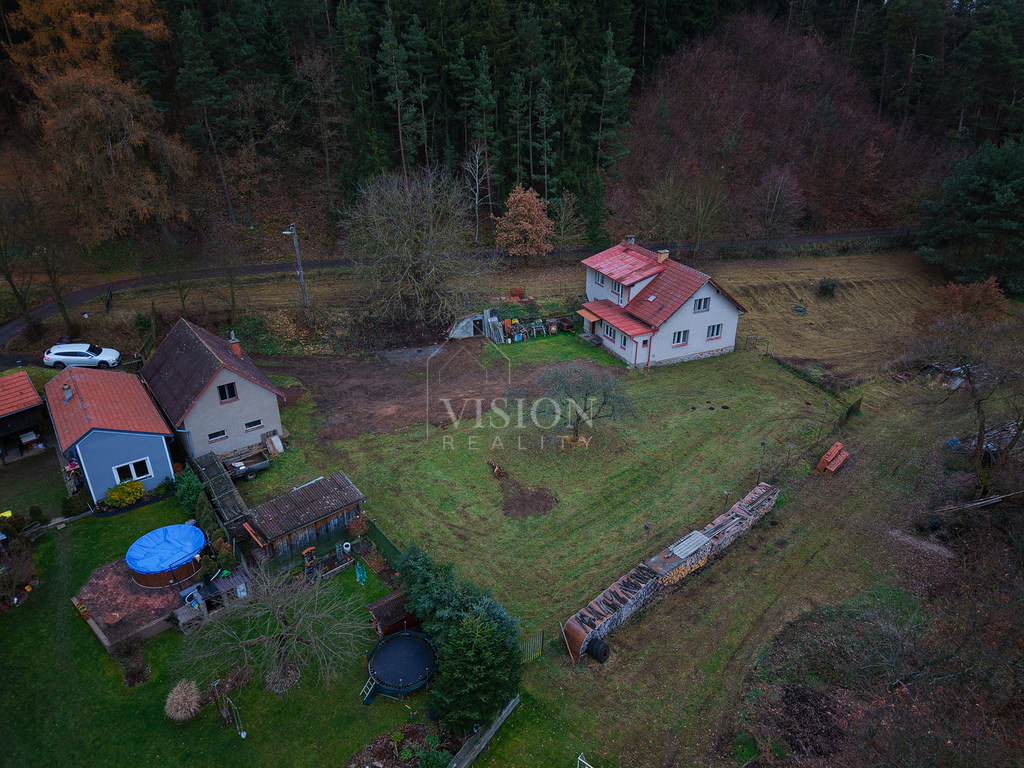 Na pozemku se nachází také samostatná garáž s dílnou, kterou je možné vytápět rovněž na pevná paliva. K dispozici je také venkovní sklípek a dřevník, což rozšiřuje praktické využití celého areálu. Celkový prostor pozemku nabízí dostatek místa pro další uspořádání podle potřeb nového majitele.
