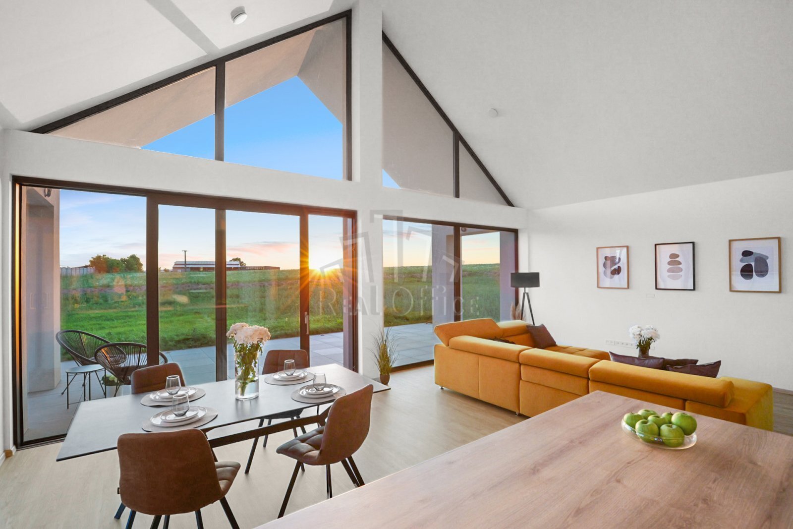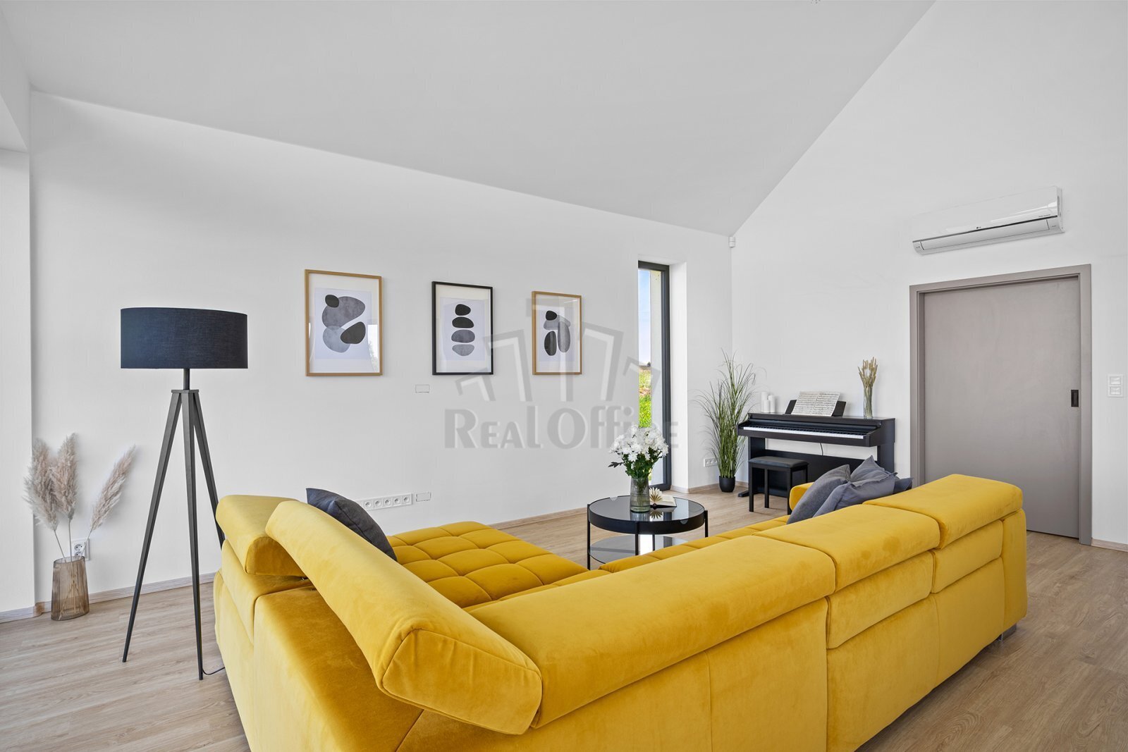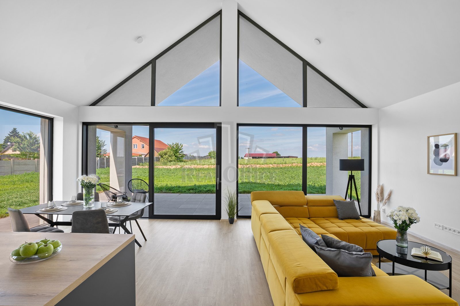 Dominantou domu kolaudovaného v roce 2024 je obývací část propojená s kuchyní a jídelnou o CP 48,5 m2, což odpovídá modernímu konceptu bydlení. Přes velká okna se společenská místnost otevírá do zahrady. Přechod mezi interiérem a zahradou tvoří prostorná terasa vydlážděná velkoformátovými keramickými dlaždicemi, které ladí s celkovým stylem stavby. V domě dále najdete ložnici se šatnou a koupelnou, dva pokoje, samostatnou toaletu, samostatnou koupelnu, technickou místnost, komoru a pochozí půdní prostory.