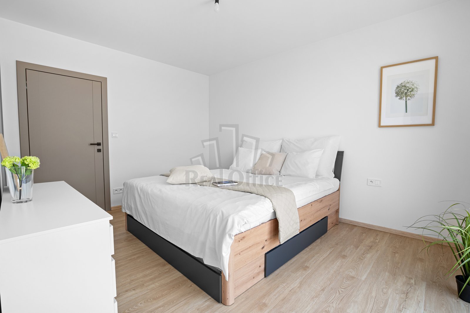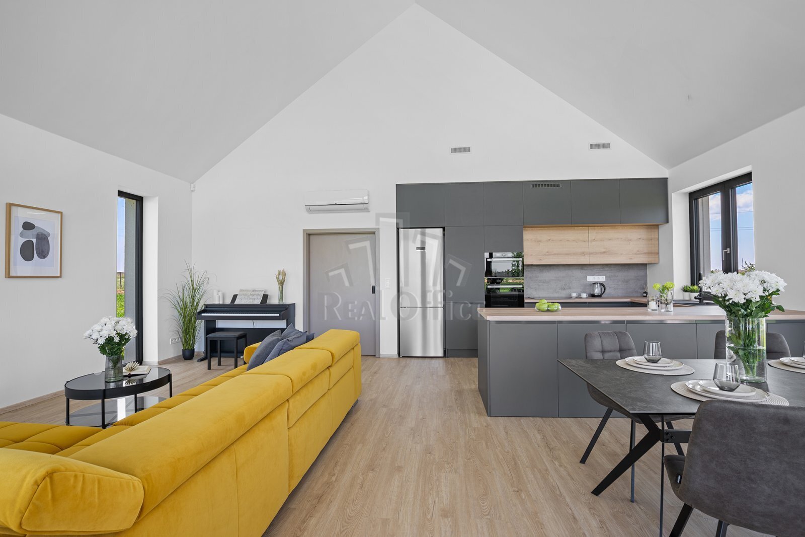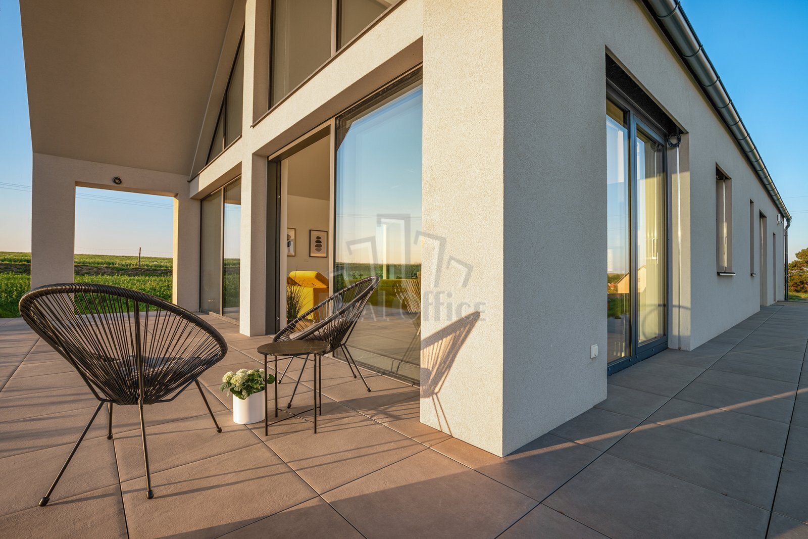 Dominantou domu kolaudovaného v roce 2024 je obývací část propojená s kuchyní a jídelnou o CP 48,5 m2, což odpovídá modernímu konceptu bydlení. Přes velká okna se společenská místnost otevírá do zahrady. Přechod mezi interiérem a zahradou tvoří prostorná terasa vydlážděná velkoformátovými keramickými dlaždicemi, které ladí s celkovým stylem stavby. V domě dále najdete ložnici se šatnou a koupelnou, dva pokoje, samostatnou toaletu, samostatnou koupelnu, technickou místnost, komoru a pochozí půdní prostory.
