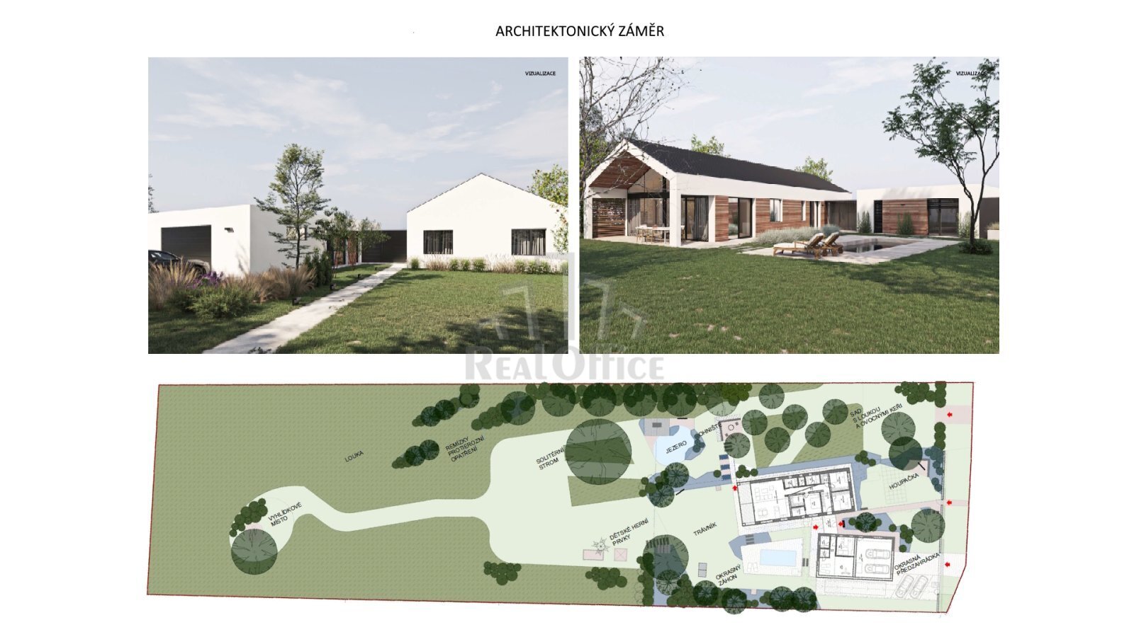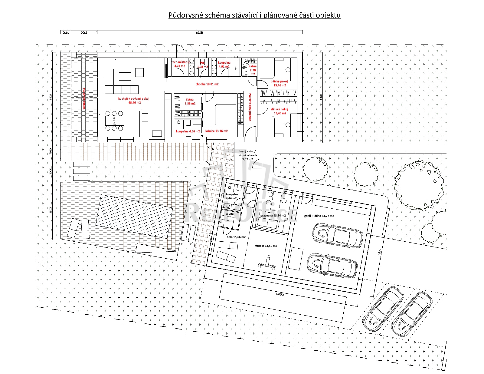 K dispozici je kompletní architektonická studie pro dostavbu dvojgaráže, dílny, fitness (užitná plocha 112 m2, základová deska již vybudována) a bazén.