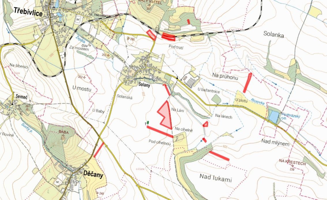 V katastrálním území Solany, obec Děčany, okres Litoměřice, nabízíme k prodeji rozsáhlý komplex pozemků ve výlučném vlastnictví o celkové výměře 75 550 m. Pozemky jsou zapsány na listu vlastnictví č. 59.