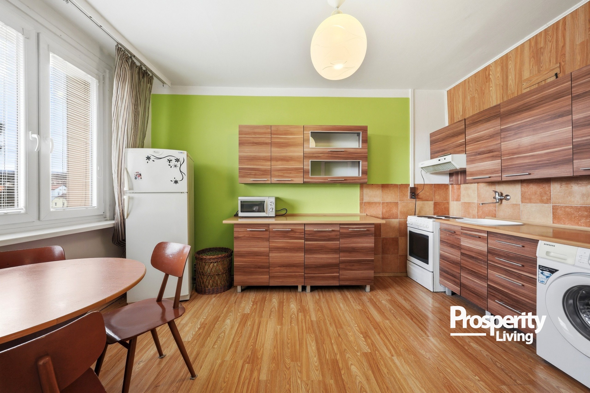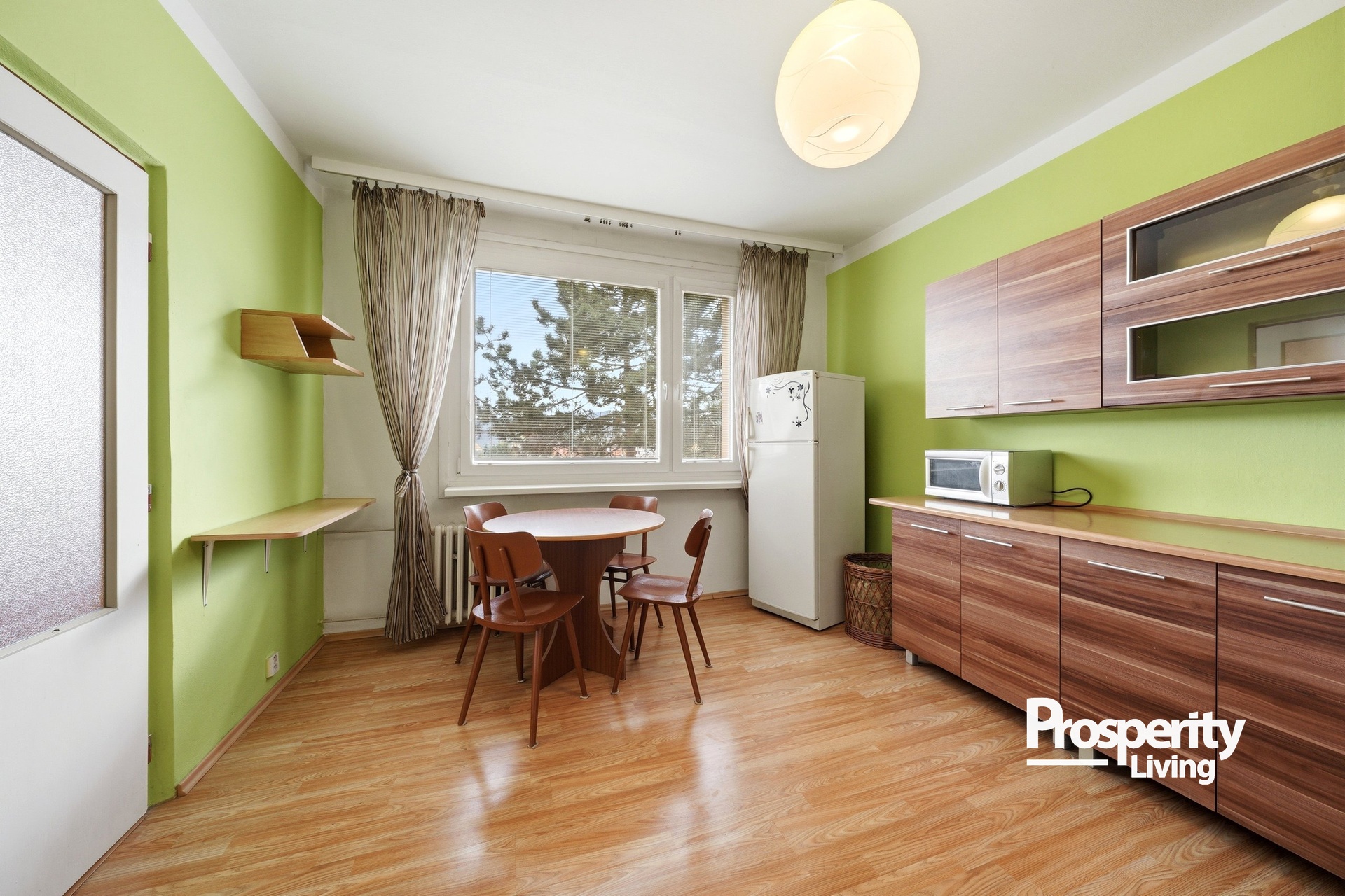 Kuchyň je vybavena kuchyňskou linkou a základními spotřebiči. Obytný pokoj působí světlým dojmem díky velkému oknu.