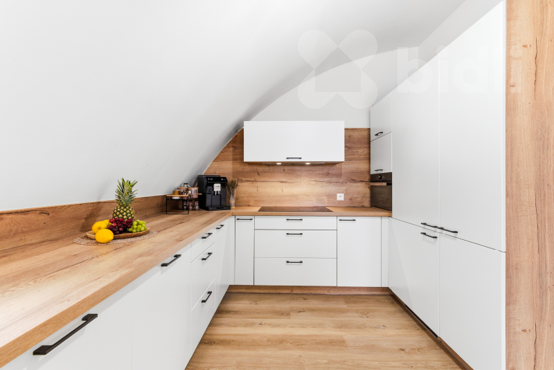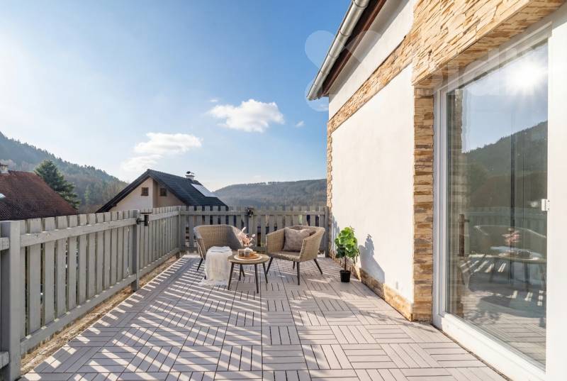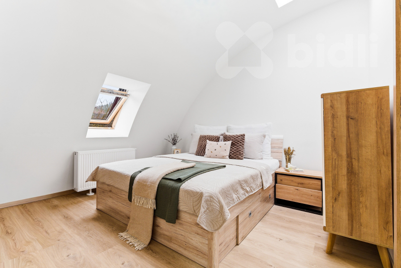 Dva samostatné pokoje, šatna, koupelna s vanou i sprchovým koutem a vstup na prostornou terasu. Ve čtvrtém nadzemním podlaží se nachází další obytný prostor s kuchyňským koutem, samostatný pokoj a WC.