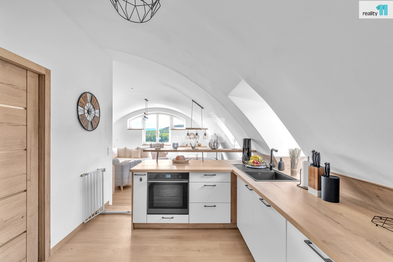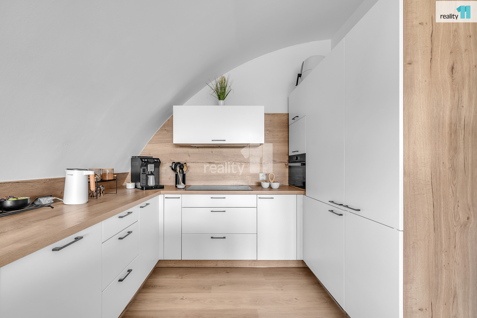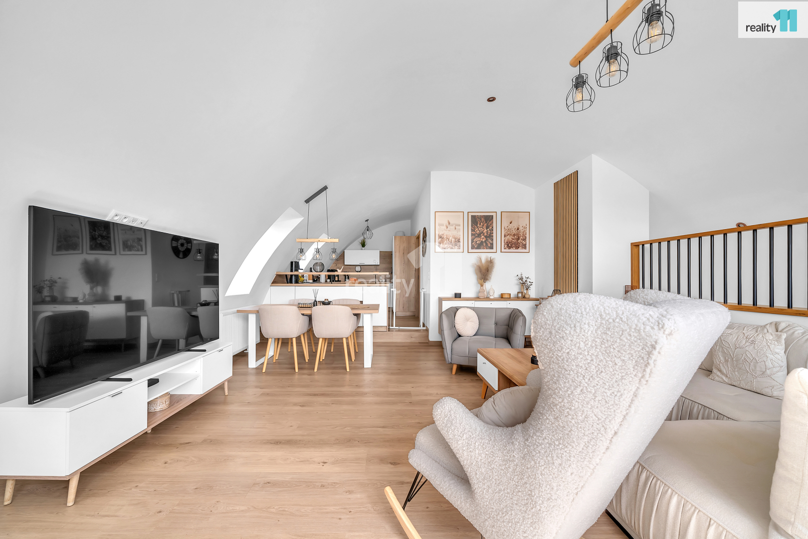 ve 4. NP obytný prostor s kuchyňským koutem, samostatný pokoj a WC.