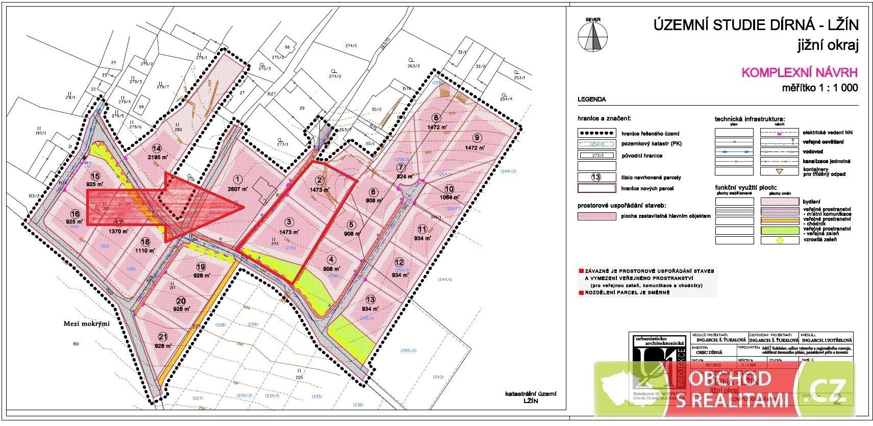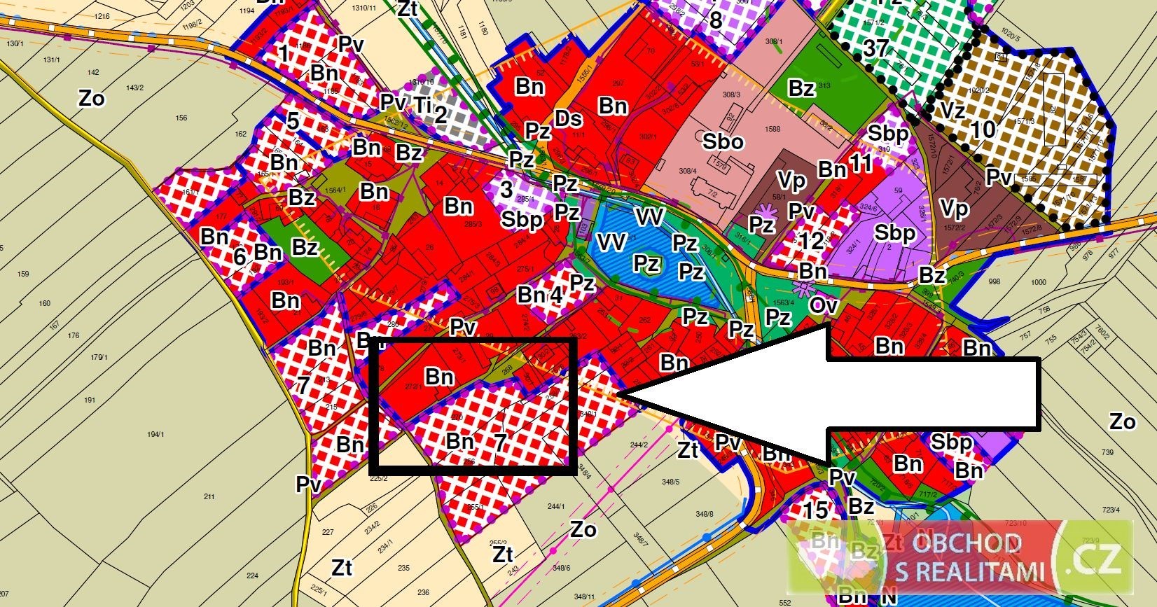 Pozemek je součástí zpracované územní studie. Tato studie připouští rozdělení pozemku na dvě stavební parcely, dále je ze studie dobře patrná případná další parcelace přilehlých pozemků, kupující tak má dobrou představu o možném budoucím využití pozemků v těsné blízkosti.