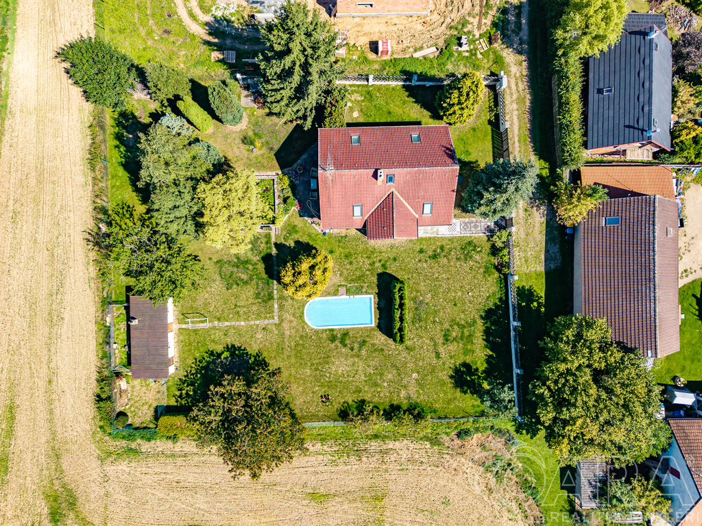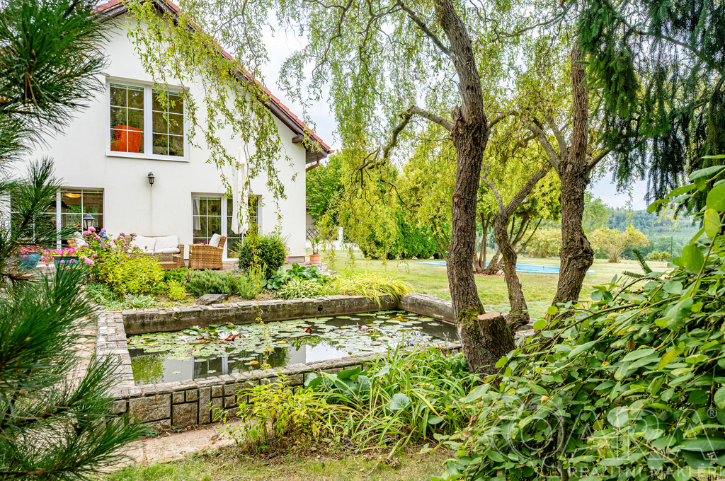 Vzrostlá zahrada poskytuje soukromí, krásné výhledy a dostatek prostoru pro odpočinek i volnočasové aktivity. Na terasu navazuje jezírko napájené dešťovou vodou, bazén s hloubkou 1,9 m a vlastní pískovou filtrací a zahradní domek, který slouží k uložení zahradního náčiní. Na pozemku najdete i zákoutí pro grilování, sport či zahradničení včetně vzrostlých ovocných stromů.
