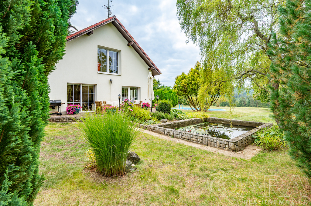 Prodej stylového nízkoenergetického rodinného domu se vzrostlou zahradou, bazénem, jezírkem a zahradním domkem v malebné obci Divišov – Radonice.