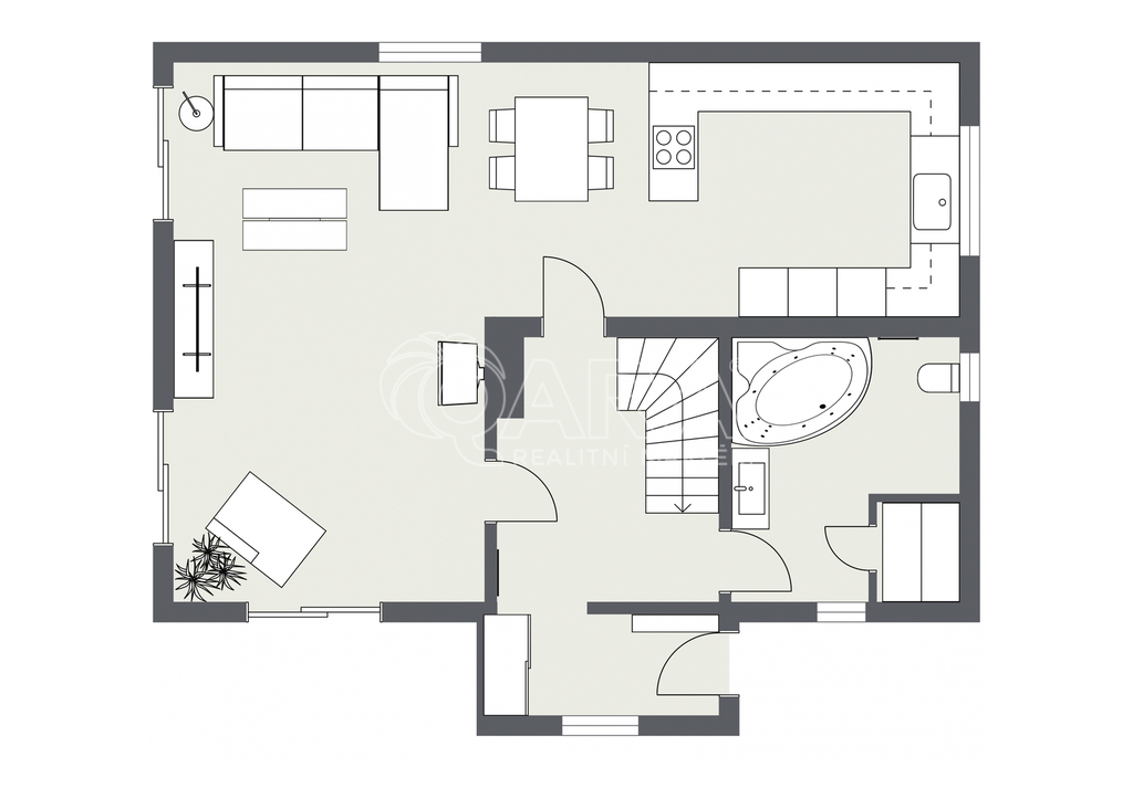 V přízemí najdete prostorný obývací pokoj se západní orientací, krbovými kamny a přímým vstupem do zahrady, velkorysou plně vybavenou kuchyni v přírodním designu a koupelnu s vanou, saunou a toaletou. Samozřejmostí je i technické zázemí.