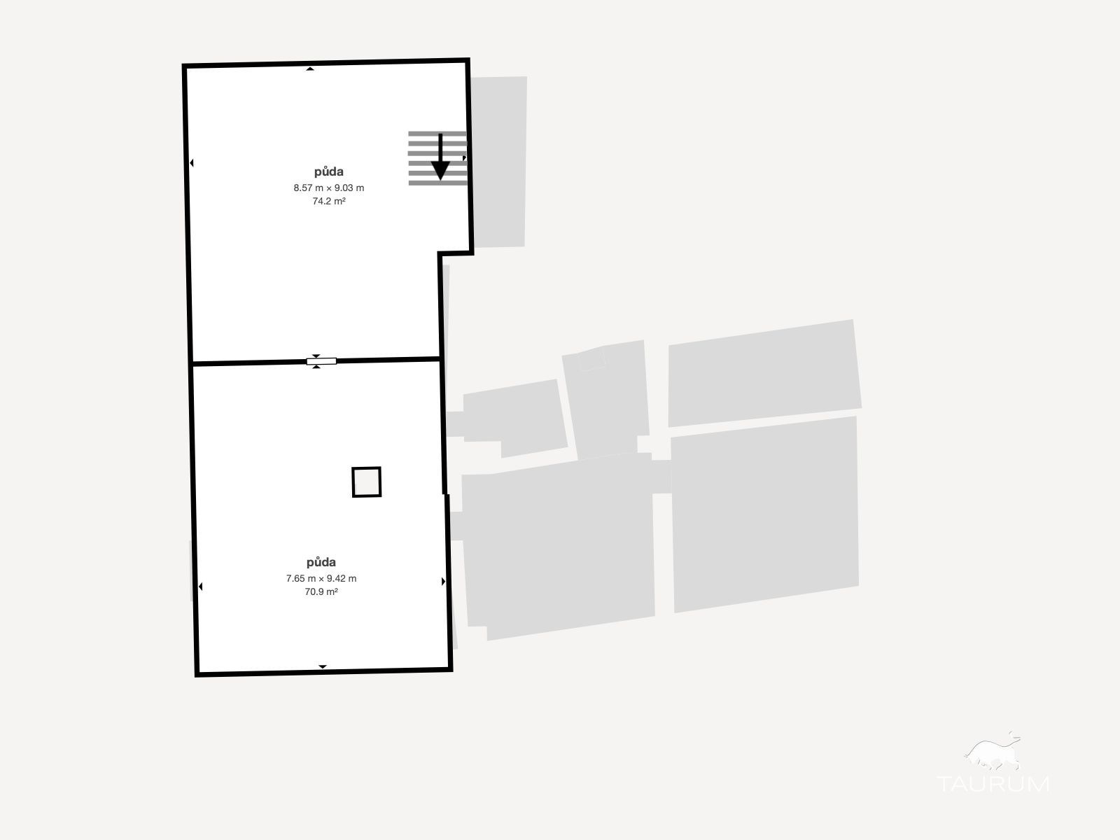 • Druhá bytová jednotka, taktéž 3+1 (obytná plocha: 115 m²), se nachází v původním stavu a je připravena k rekonstrukci dle vlastních představ.