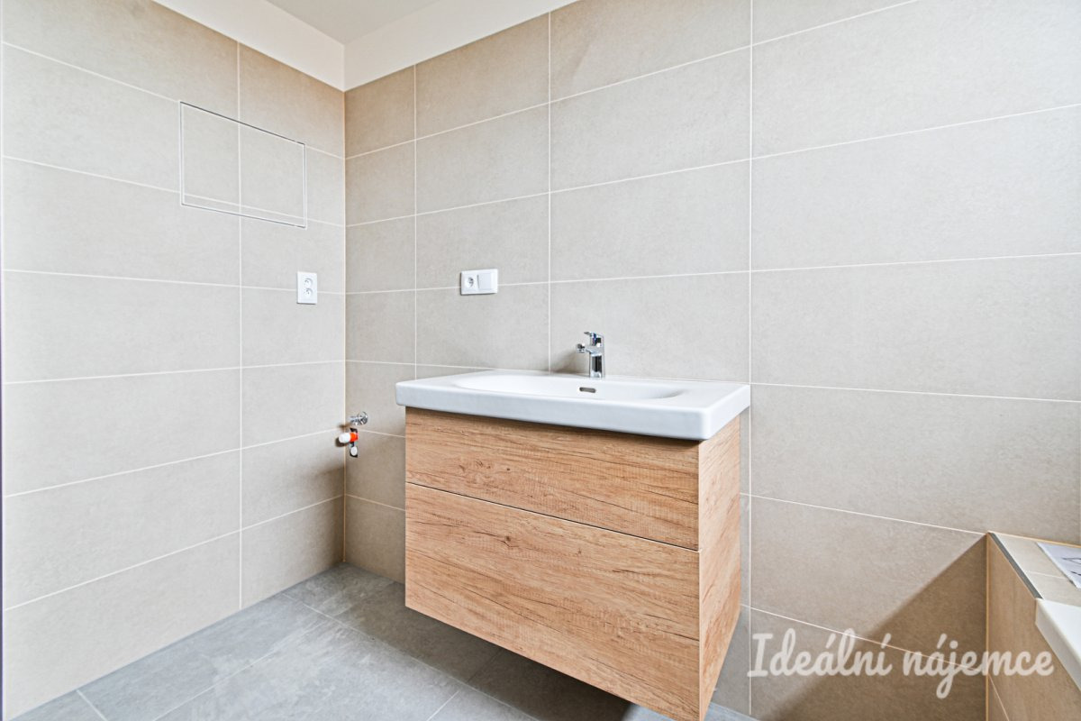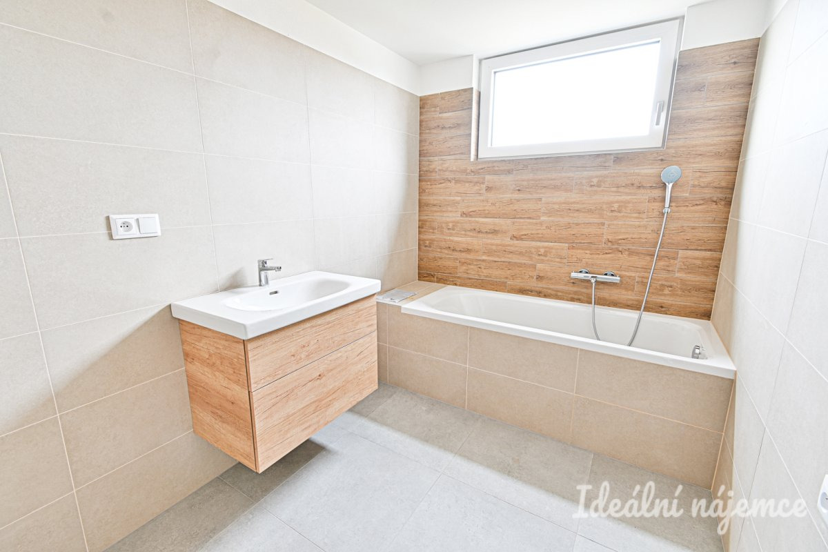 Koupelna je vybavena vanou a umyvadlovou skříňkou s umyvadlem.