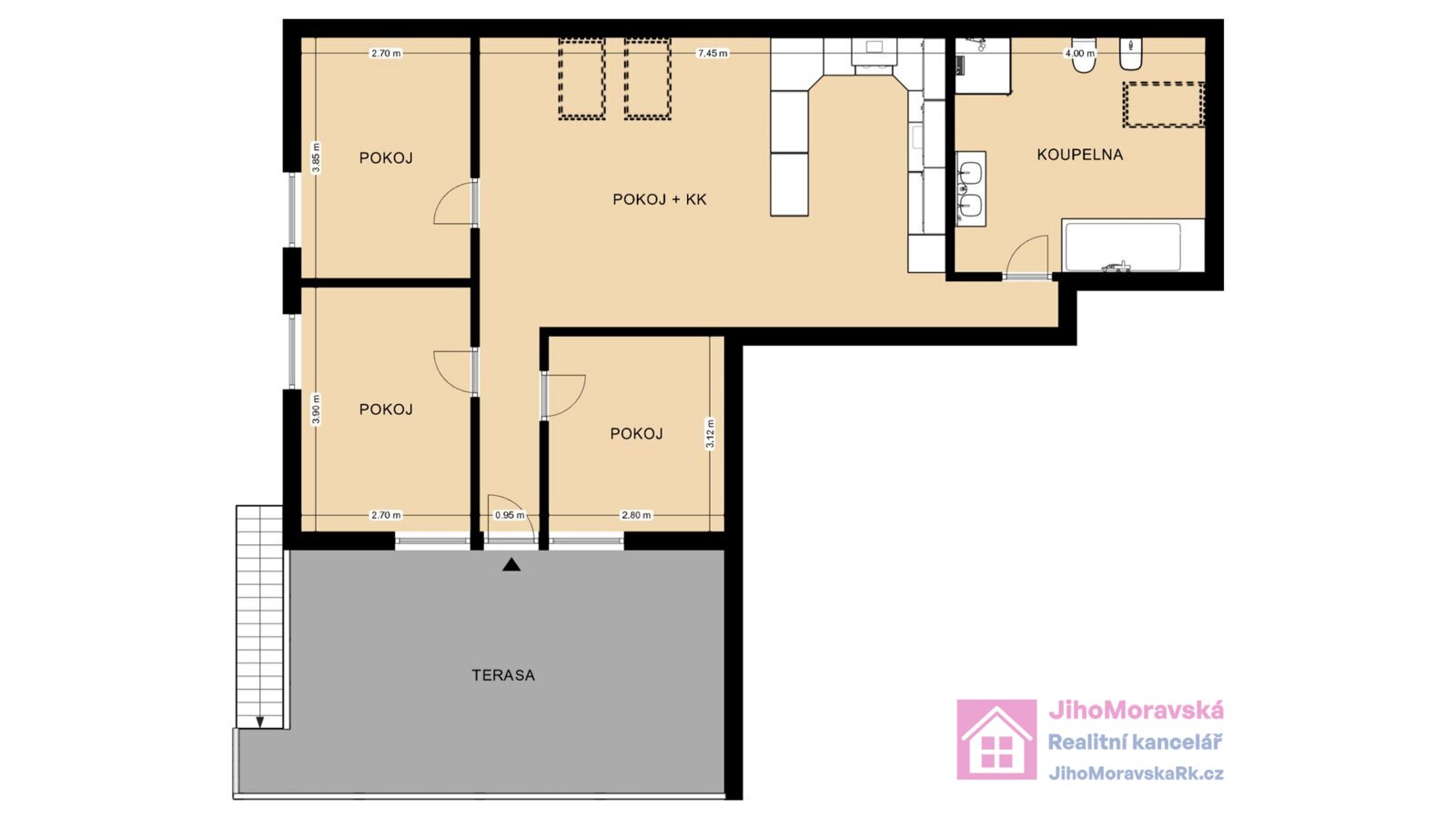 Dispozice: koupelna (WC, vana, sprchový kout, chodba, pokoj s plně vybaveným kuchyňským koutem (lednice s mrazničkou, sklokeramická varná deska, elektrická trouba a myčka), tři neprůchozí pokoje, předsíň a terasa. Půdorys bytu naleznete ve fotogalerii.