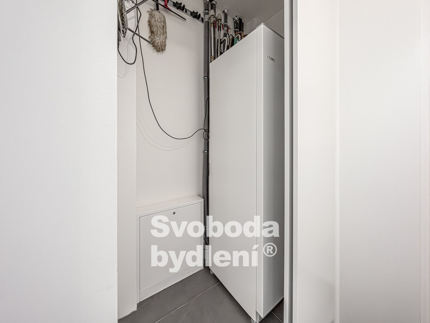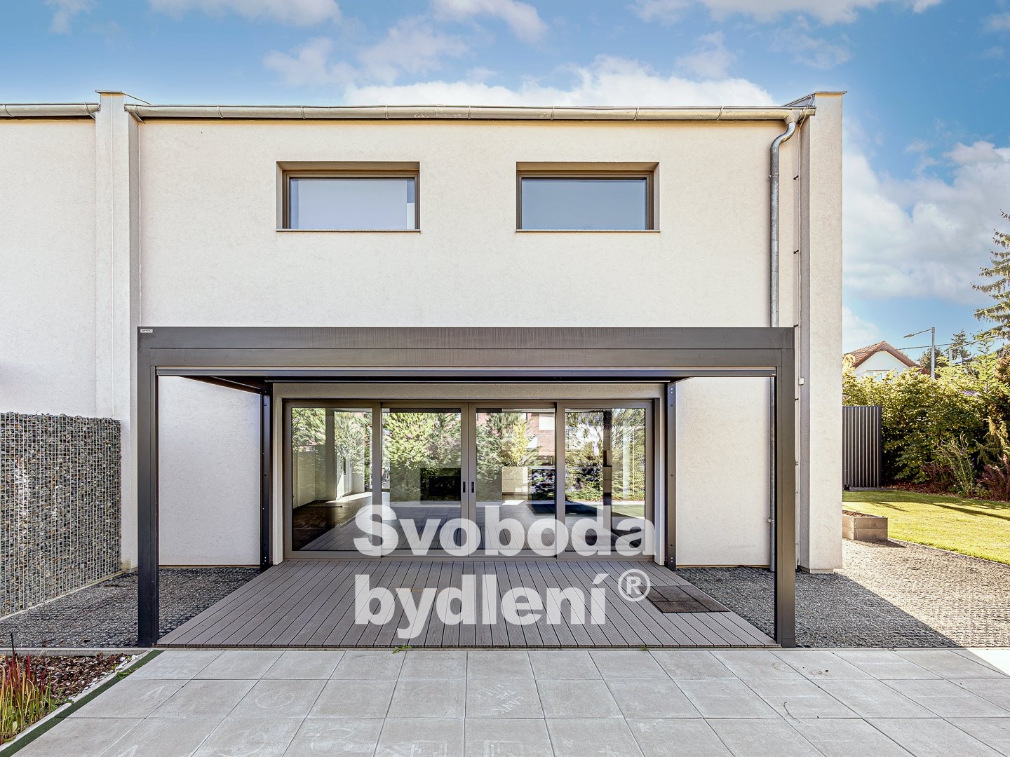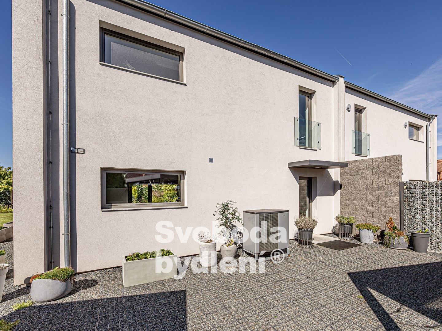 Technické informace: Pozemky celkem 678m2, z toho zastavěná plocha 89m2 + 21m2, užitná plocha domu 161m2. Dům postavený z YTONGu, zatepleno 20cm polystyrenu včetně izolace proti vzniku tepelných mostů, Energetická třída B, střešní krytina Tondach - černá pálená taška, hliníková okna i dveře s izolačním trojsklem, mramorové parapety, zavedena voda, elektřina i kanalizace (plyn není zaveden), vytápění tepelným čerpadlem voda/vzduch s vnitřním modulem (all-in-one) NIBE VVM320, podlahové vytápění v obou podlažích, jednotka v zimě topí a v létě chladí; sanita Villeroy & Boch, vodovodní baterie Hansgrohe, designové osvětlení Catellani&Smith, Artemide a Rendl Studio, Internet/wifi modem; podlahová krytina v 1. NP je velkoformátová (90x90cm) italská dlažba, ve 2. NP plovoucí podlahy; obklady zakončené hliníkovými lištami, všechny interiérové (bezfalcové) dveře mají zapuštěné panty a magnetické jazýčky. Automatická závlaha (kapačka) a robotická sekačka. Na prodej je polovina dvojdomu, domy mají samostatné obvodové zdi a jsou navíc zvukově odděleny polystyrenem. Měsíční náklady na provoz domu jsou cca 5.000,-Kč (elektřina + voda).