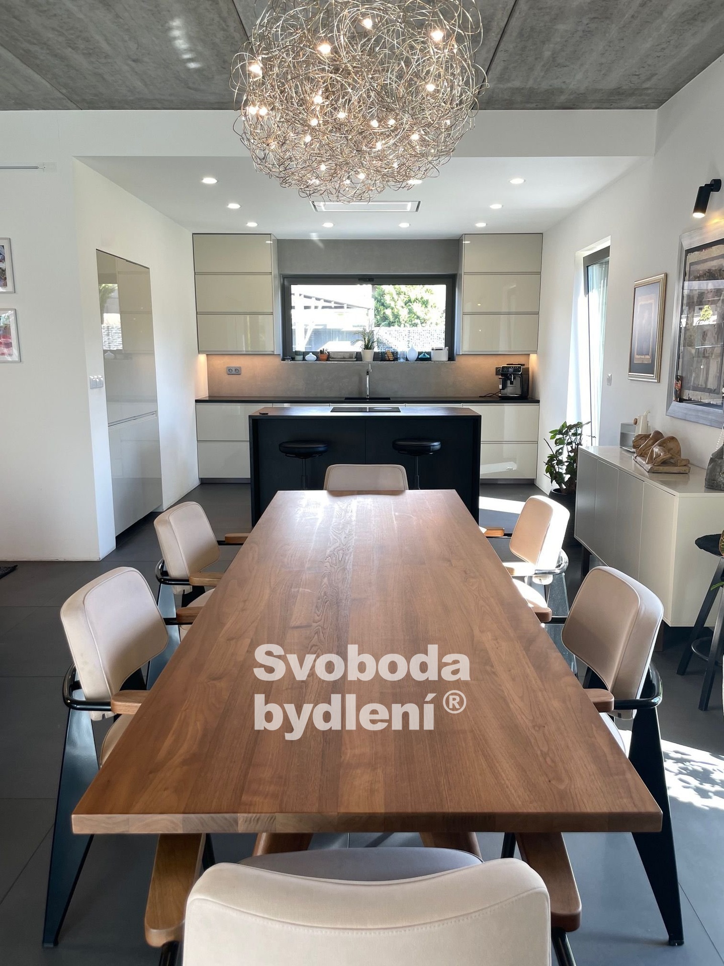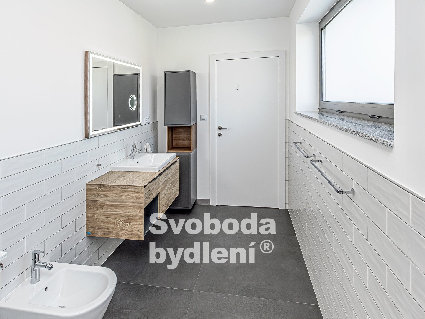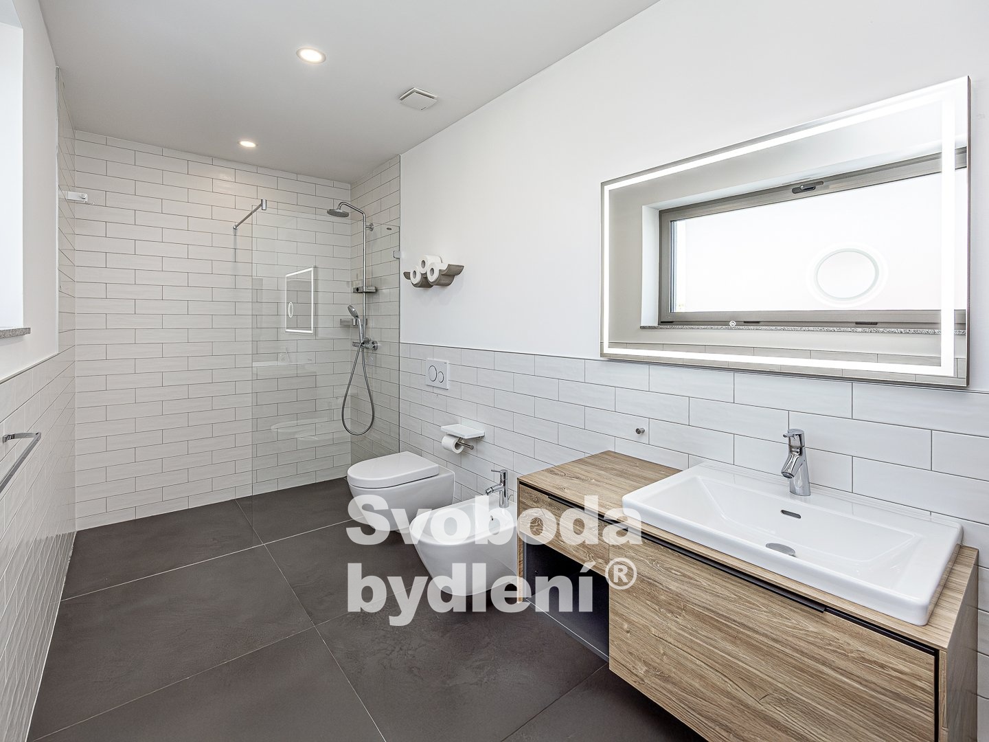 Technické informace: Pozemky celkem 678m2, z toho zastavěná plocha 89m2 + 21m2, užitná plocha domu 161m2. Dům postavený z YTONGu, zatepleno 20cm polystyrenu včetně izolace proti vzniku tepelných mostů, Energetická třída B, střešní krytina Tondach - černá pálená taška, hliníková okna i dveře s izolačním trojsklem, mramorové parapety, zavedena voda, elektřina i kanalizace (plyn není zaveden), vytápění tepelným čerpadlem voda/vzduch s vnitřním modulem (all-in-one) NIBE VVM320, podlahové vytápění v obou podlažích, jednotka v zimě topí a v létě chladí; sanita Villeroy & Boch, vodovodní baterie Hansgrohe, designové osvětlení Catellani&Smith, Artemide a Rendl Studio, Internet/wifi modem; podlahová krytina v 1. NP je velkoformátová (90x90cm) italská dlažba, ve 2. NP plovoucí podlahy; obklady zakončené hliníkovými lištami, všechny interiérové (bezfalcové) dveře mají zapuštěné panty a magnetické jazýčky. Automatická závlaha (kapačka) a robotická sekačka. Na prodej je polovina dvojdomu, domy mají samostatné obvodové zdi a jsou navíc zvukově odděleny polystyrenem. Měsíční náklady na provoz domu jsou cca 5.000,-Kč (elektřina + voda).