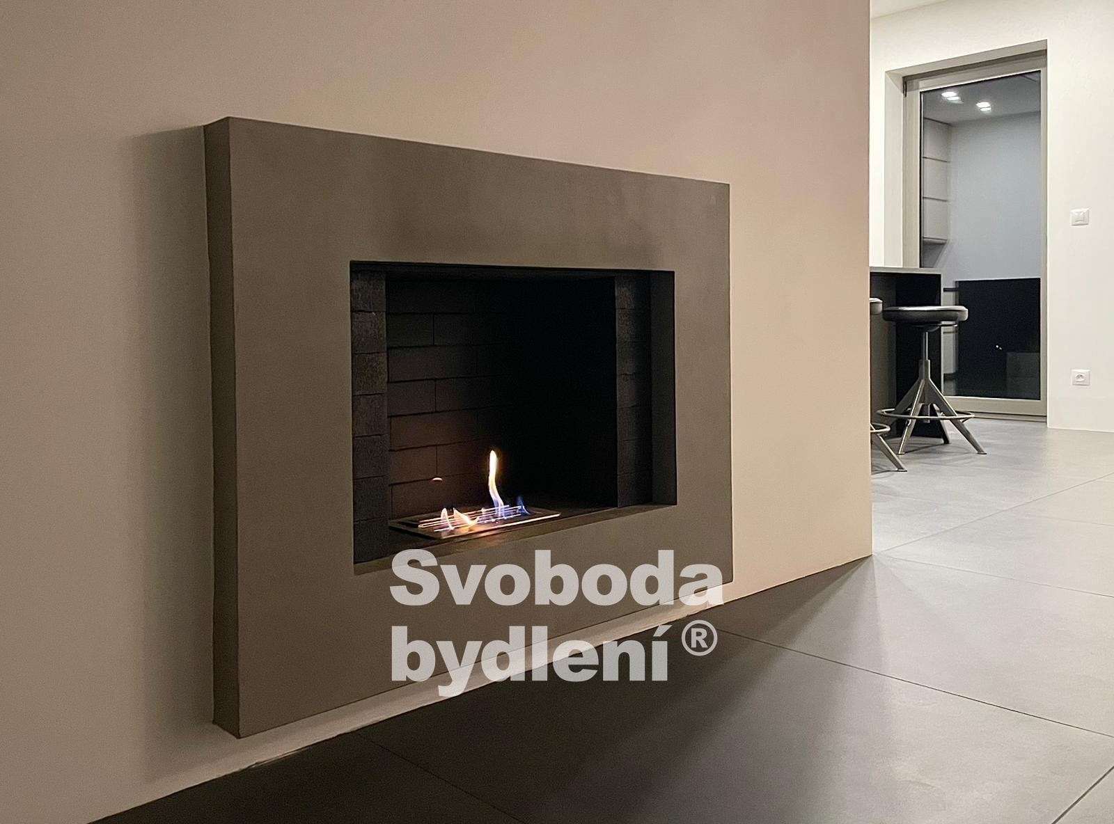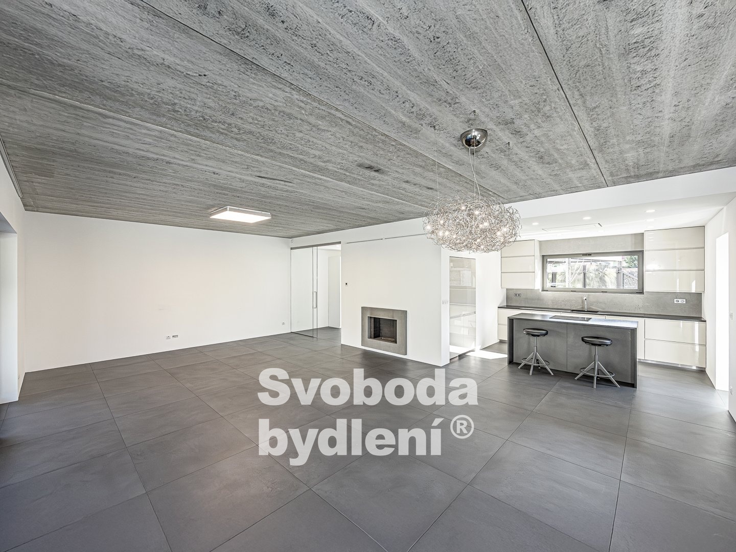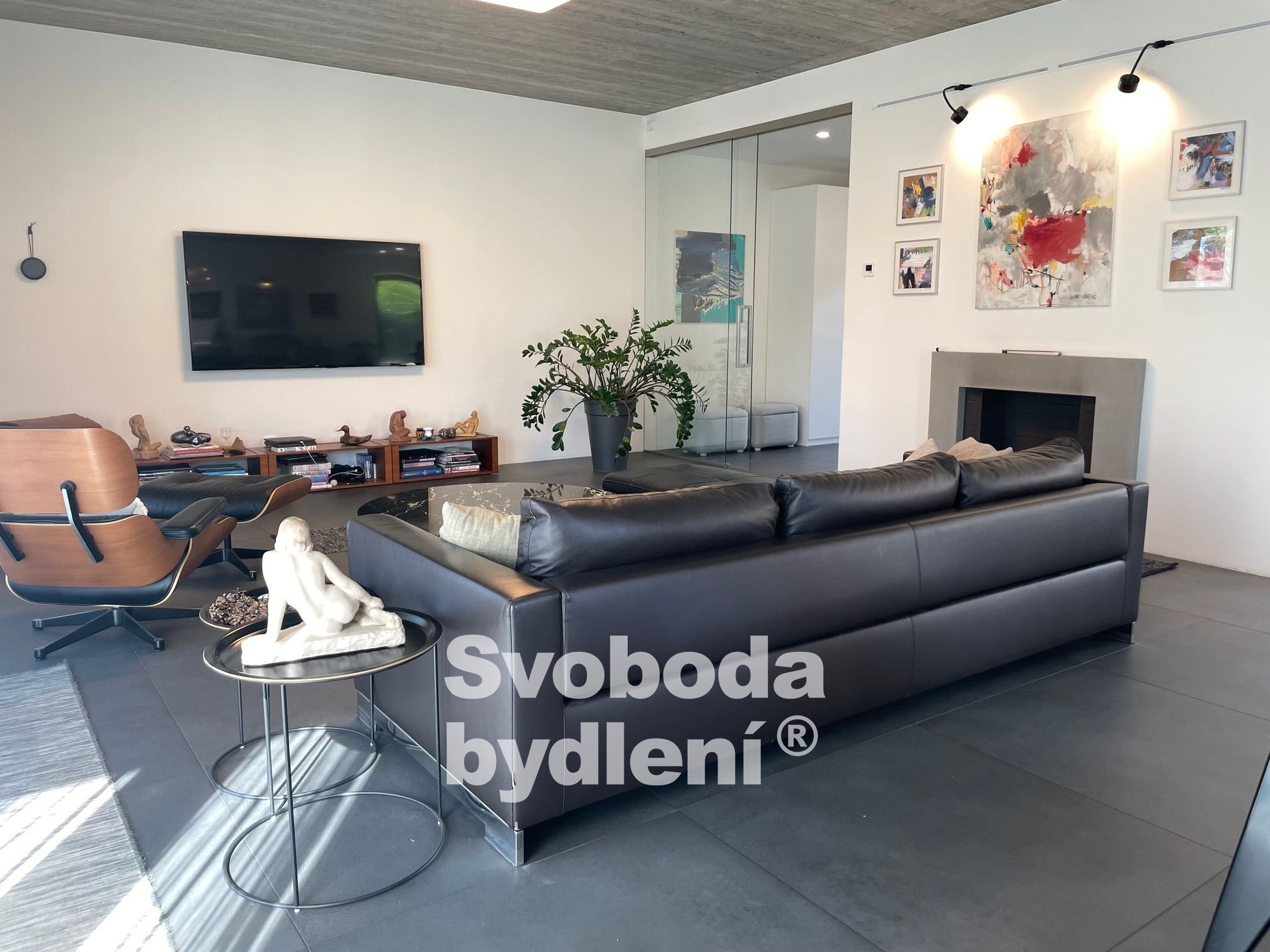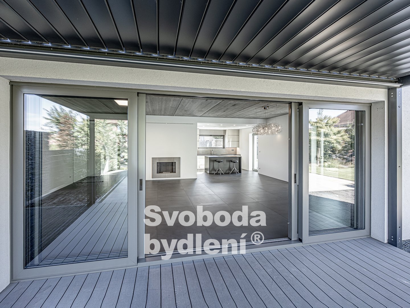 Přestože se jedná o dvojdům (na prodej je pouze levá část domu s výhodnější orientací – J, V, Z), nabízí dostatek dnes tolik potřebného soukromí pro jeho obyvatele. Přitom jeho 1.NP umožní pohostit i početnější skupinu návštěvníků. Velkorysý obývací pokoj s plochou téměř 48m2 a výškou stropu 2,86m (pohledový beton) je největší místností v domě, doslova jeho dominantou. Z něj se vstupuje francouzskými velkoformátovými dvoukřídlými posuvnými dveřmi na klidnou terasu (20m2) s bioklimatickým zastřešením Artosi. Součástí jsou ze dvou stran elektrické vytahovací rolety. Při otevření obou křídel vzniká přirozené propojení obytného prostoru s terasou a navazující zahradou za domem.