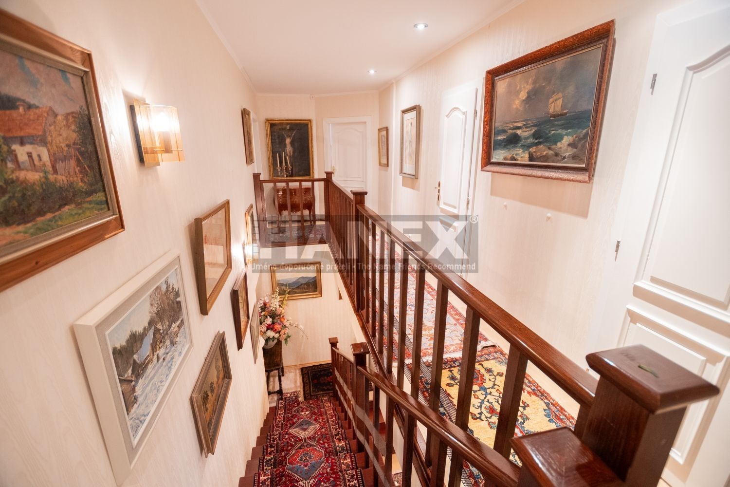 V patře je hlavní ložnice se šatnou, vlastní koupelnou a balkonem 11 m2, pokoj pro hosty se šatnou a koupelnou, další dva pokoje, koupelna a toaleta.