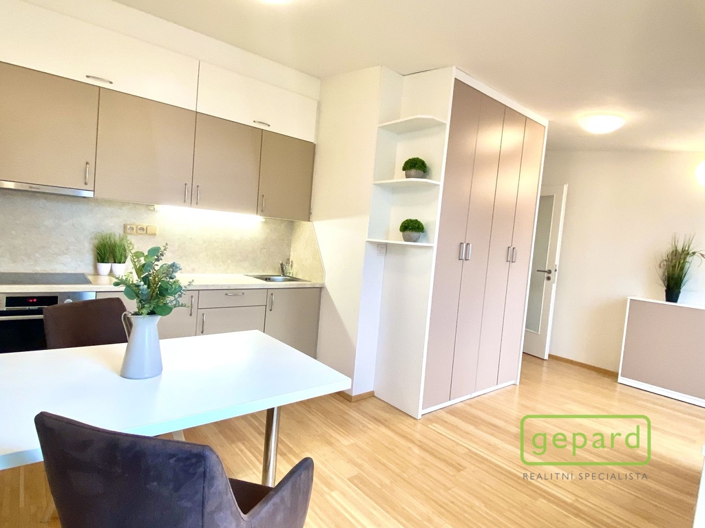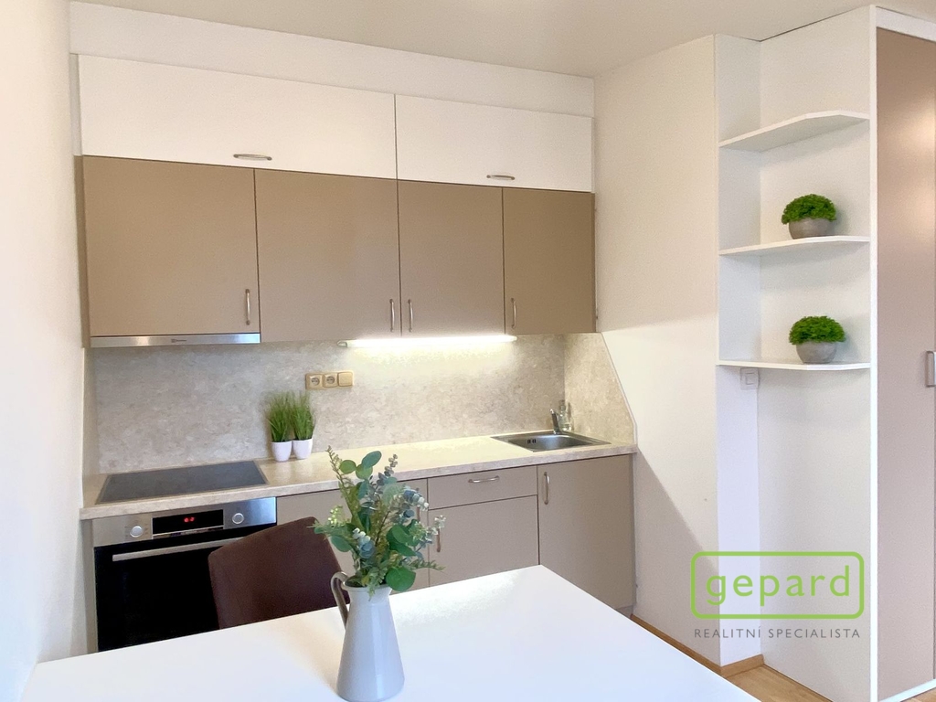 Kuchyňská linka je vybavena vestavěnou lednicí, sklokeramickou varnou deskou, pečicí troubou a digestoří. V obytném prostoru najdete množství úložných prostor vyrobených na míru truhlářem a samozřejmostí je také klimatizační jednotka. Byt se pronajímá kompletně zařízený – stačí si přinést osobní věci a můžete bydlet.