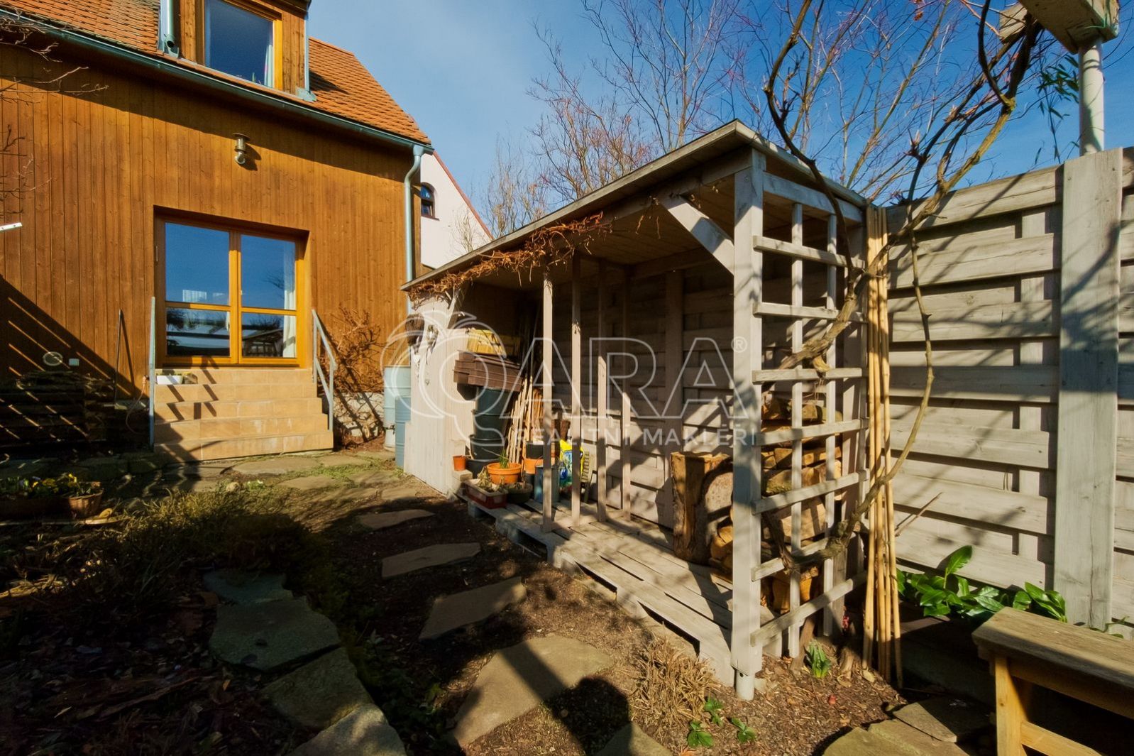 Společným prostorem domu o třech bytových jednotkách je vstupní dvůr, kde je pro každý byt k dispozici kolna pro uskladnění kol, zahradních potřeb apod.