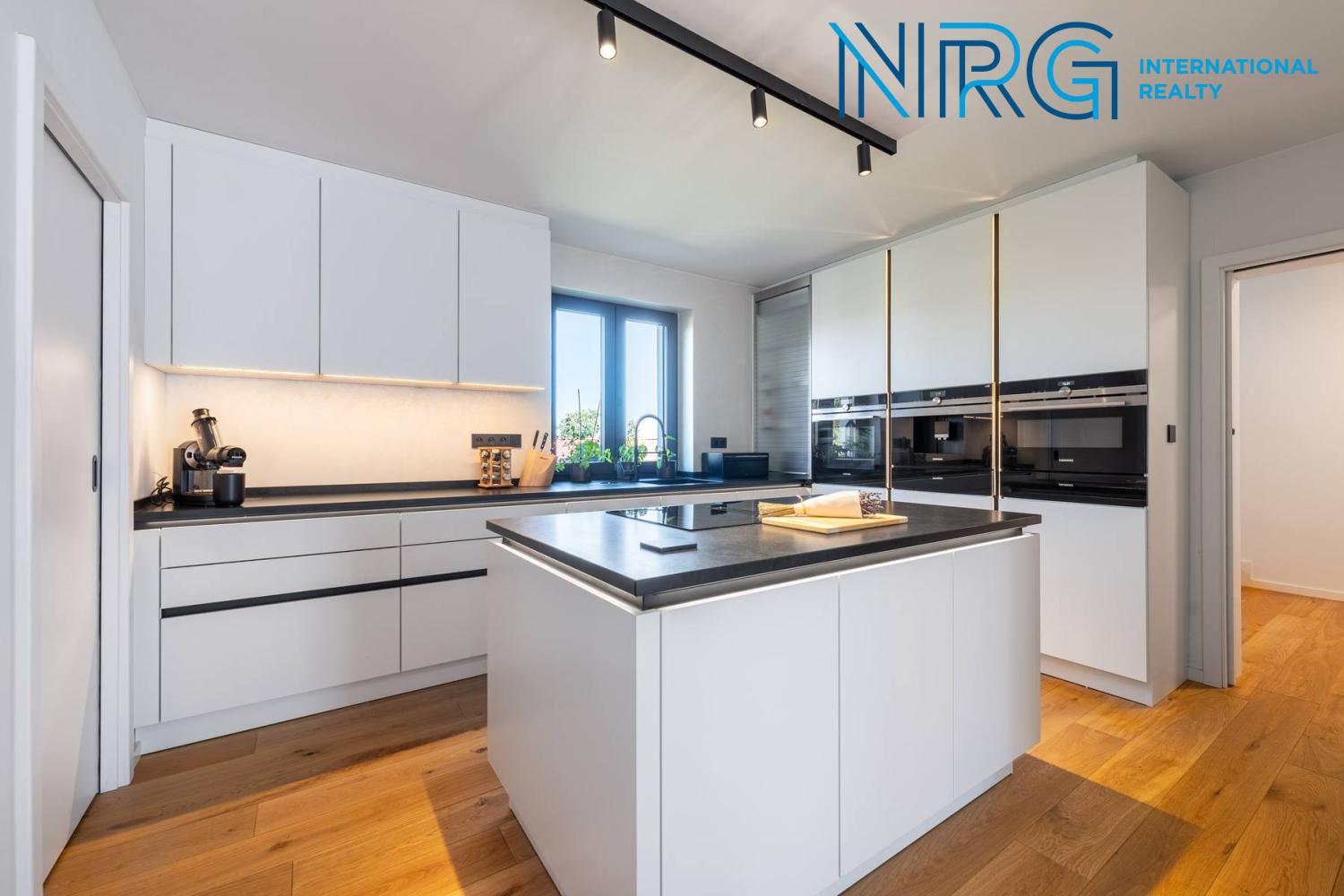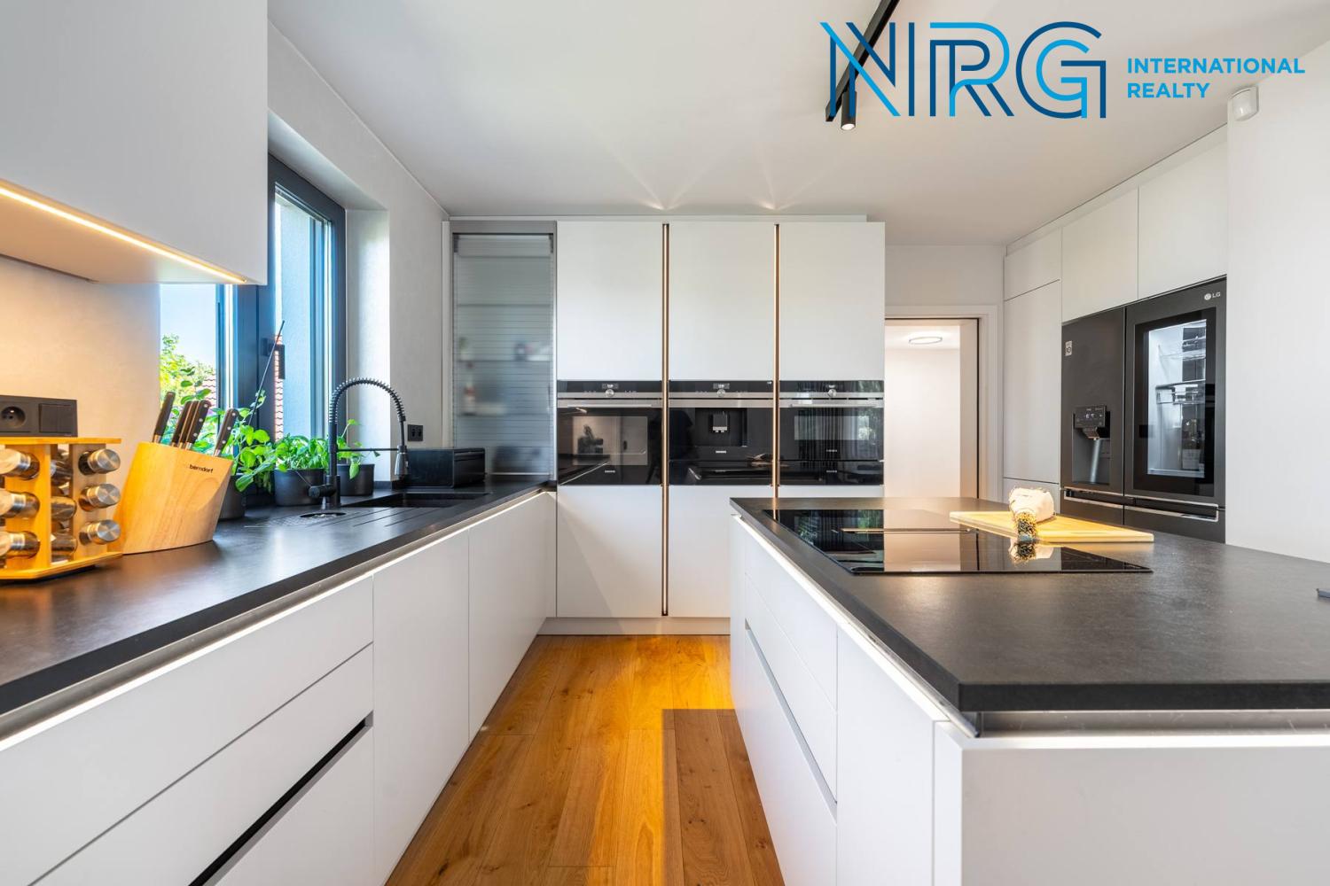 Designová kuchyně na míru: Plně integrovanou vybavená americkou lednicí, parní troubou, kávovarem, mikrovlnnou troubou a indukční deskou se spodním odsáváním. Luxusní kamenná deska podtrhuje její eleganci.