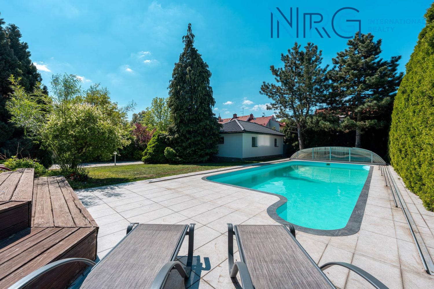 Wellness a relaxace: Obrovský bazén v zahradě. V suterénu domu pak naleznete prostornou šatnu, vybavenou posilovnu, saunu a praktickou prádelnu.