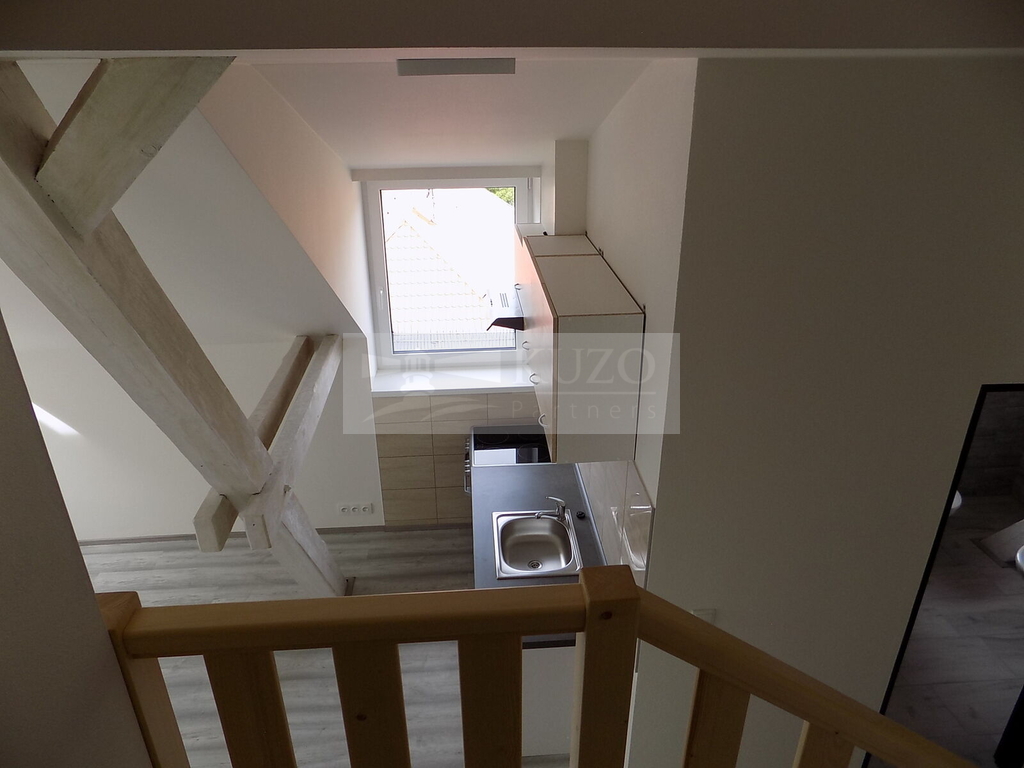 KUZO Partners s.r.o. Vám zprostředkují exkluzivně možný pronájem novostavby atypického mezonetového bytu 2+kk v nově zrekonstruovaném bytovém domě, bývalém Špýcharu, který se nachází v těsné blízkosti centra města Dobříš. Byt v OV o celkové podlahové ploše 58 m2 se nachází ve čtvrtém nadzemním podlaží čtyřpatrového cihlového domu s výtahem a bezbariérovým přístupem. Nestandardní členění bytu je následující: vstupní chodba, odtud vlevo vcházíme do kuchyně s komorou, novou kuchyňskou linkou a sporákem spojené s jídelním koutem a obývacím prostorem, odtud po schodech vystoupáme do atypického podkroví, ložnice, orientované na západ s famózním výhledem na město a okolí. Z chodby vpravo vstoupíme do samostatné koupelny se sprchovým koutem, umyvadlem, koupelnovým radiátorem a WC. Bytový dům, který disponuje deseti bytovými jednotkami, prošel nadstandardní kompletní rekonstrukcí a rozhodně uspokojí náročné klienty s požadavky vysokého standardu bydlení. Parkování je možné v těsné blízkosti domu v neplacené zóně. V blízkosti domu je veškerá občanská vybavenost. Nájemné včetně poplatků činí měsíčně 19500,- Kč ( 16000,- Kč nájemné a 3500,- Kč záloha služby/ 2 osoby). Vratná kauce činí 39000,- Kč. Ostatní informace v RK.