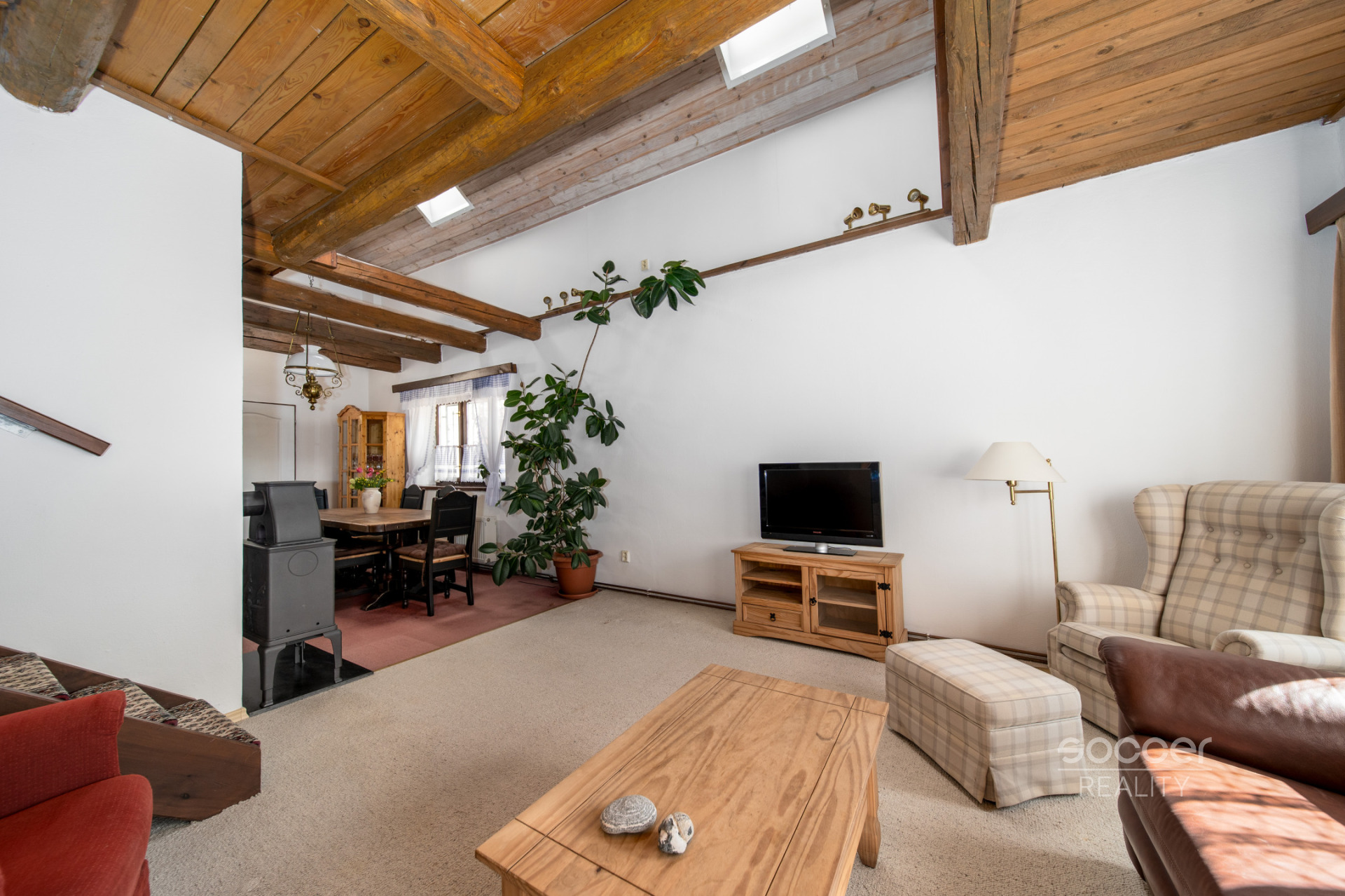 Samotný nenápadný dům vás okouzlí mimořádně útulným zázemím. Je vybaven stylovým nábytkem, který ladí s duchem místa. Dispozičně je řešen jako 3+kk, plus velká obytná galerie. Najdete zde vstupní chodbu s masivním schodištěm a dvě koupelny (jednu v přízemí a druhou v podkroví). Na obytnou galerii vede schodiště také přímo z hlavního obytného pokoje. Ten je plynule propojen s kuchyňským a jídelním koutem. Interiér mile překvapí atypickým řešením a jedinečnou atmosférou.