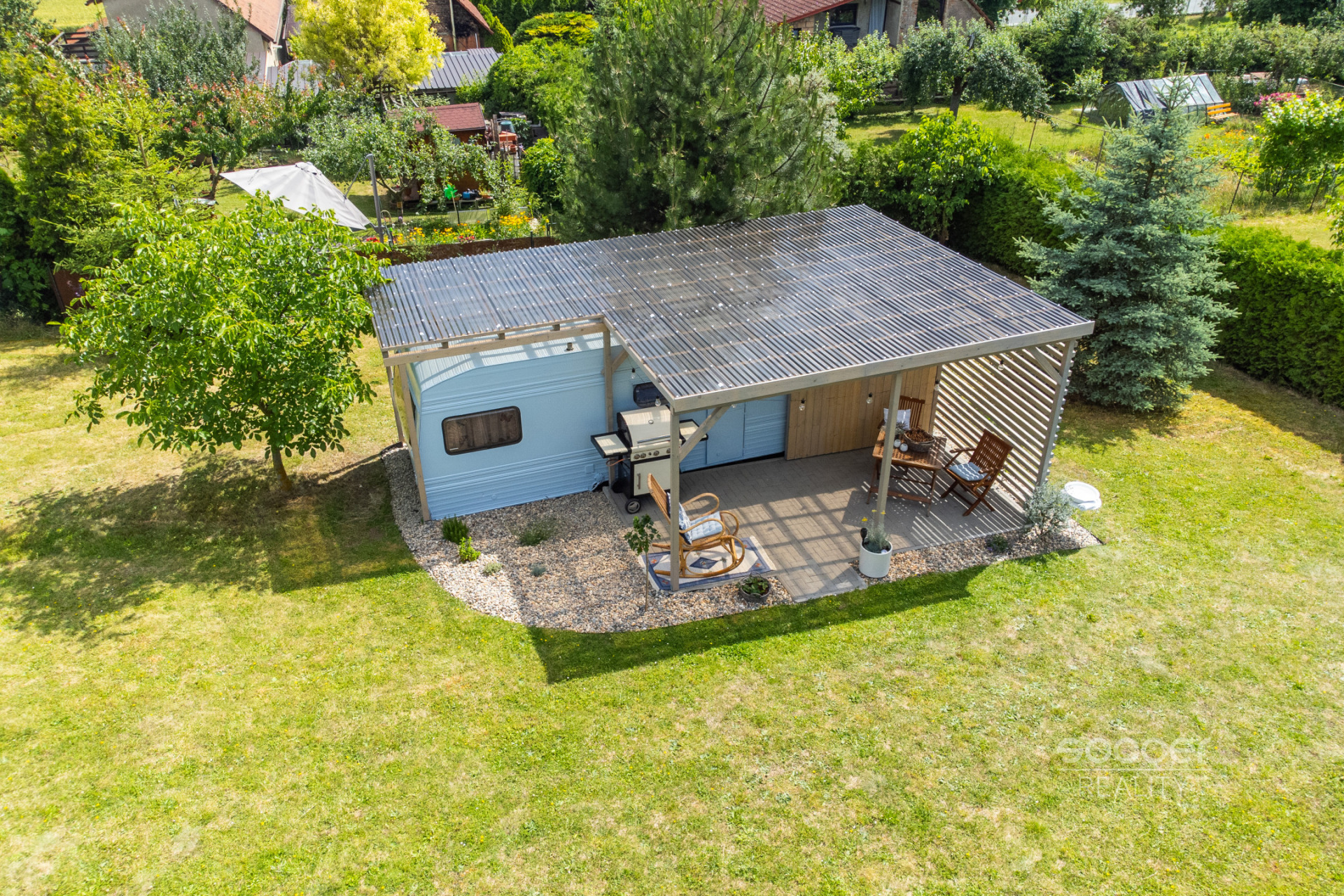 Příjemná venkovská zahrada s rekreačním karavanem a terasou.
