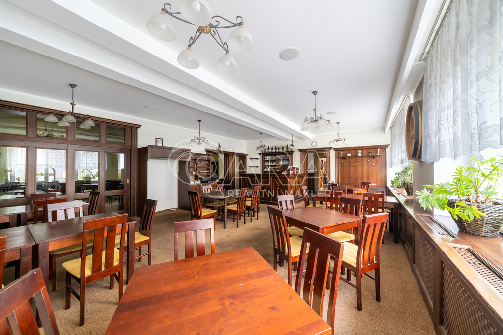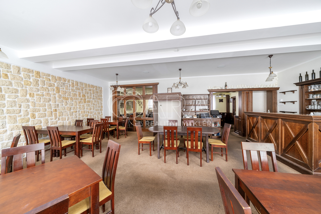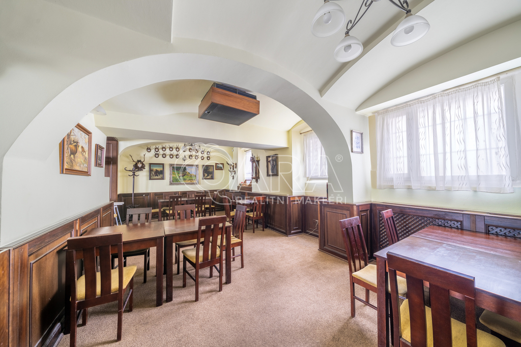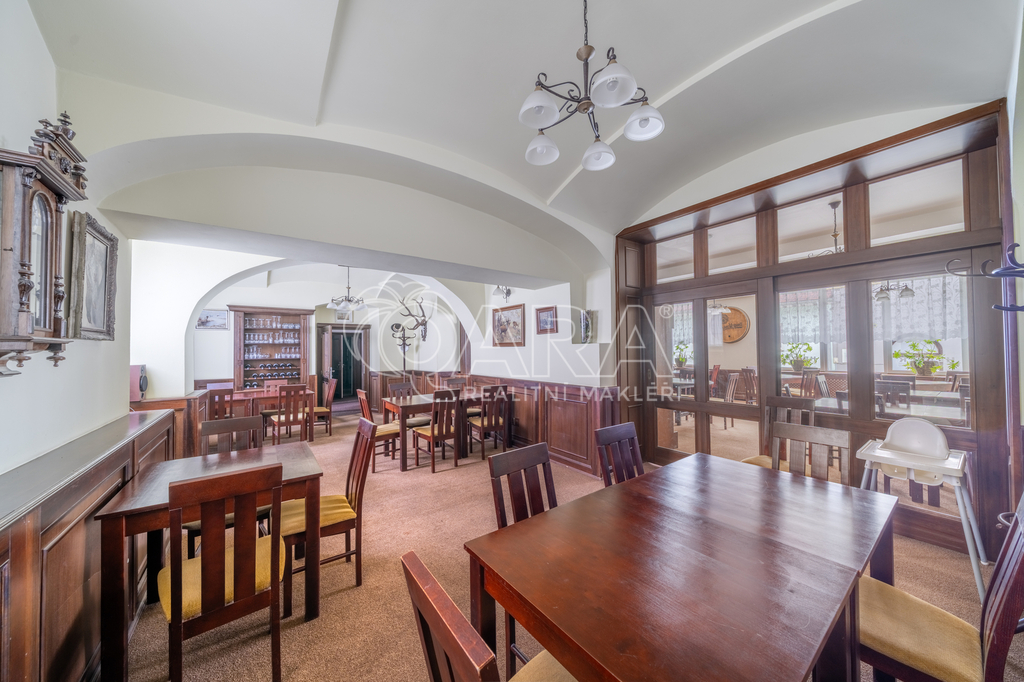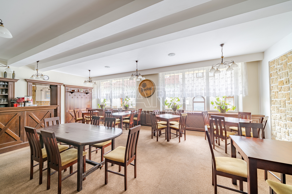 Máte jedinečnou šanci koupit restauraci Heller, která se skládá ze 2 místností, recepce, salónku, kuchyně a skladu s celkovou plochou 261 m2. Restaurace byla vždy zisková a jako jedna z mála byla provozována celoročně. V hlavní sezóně využívala i zahrádku na ulici, celková kapacita je asi 120 míst. Patří k ní i rozsáhlé sklepy ve výhradním užívání a 3 parkovací místa v zadní části. A k tomu všemu ještě rozlehlá půda s vysokými stropy o ploše 165 m2, kde můžete vytvořit 3 ubytovací jednotky. Rozvody jsou připraveny.