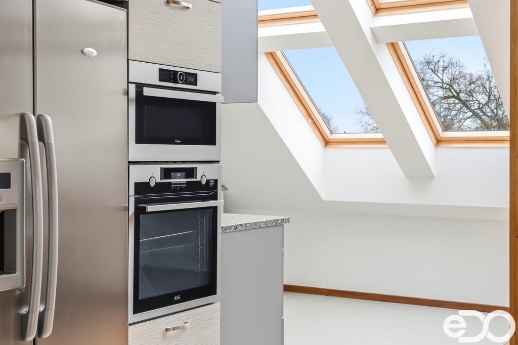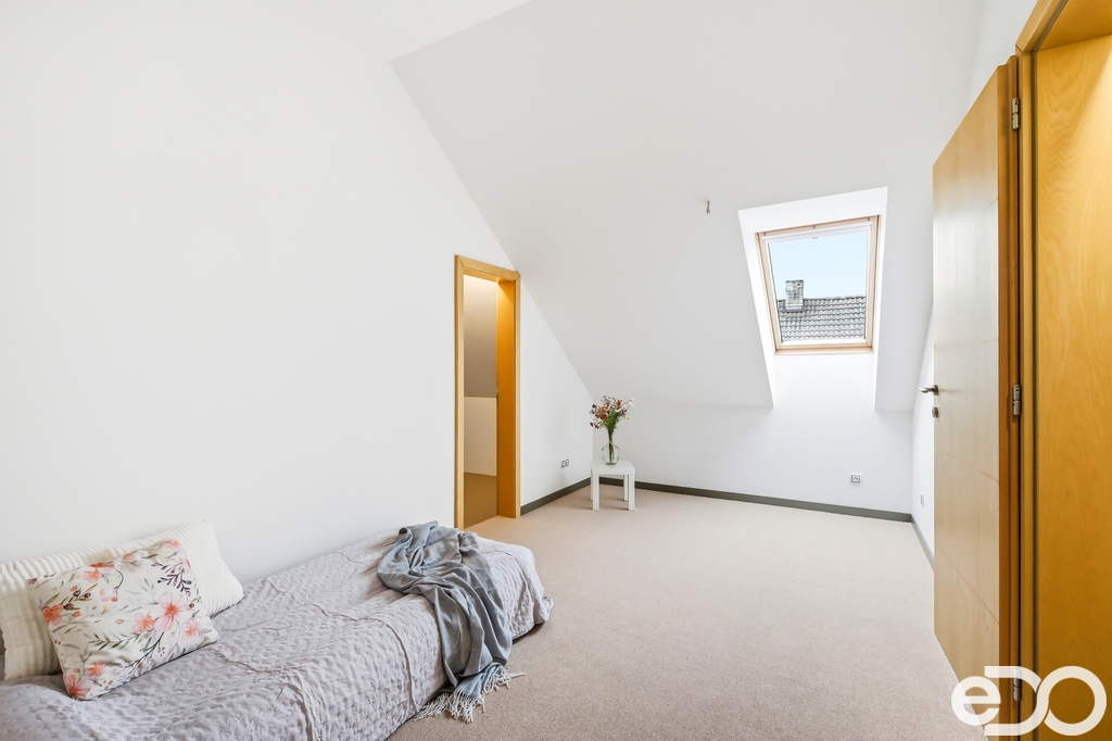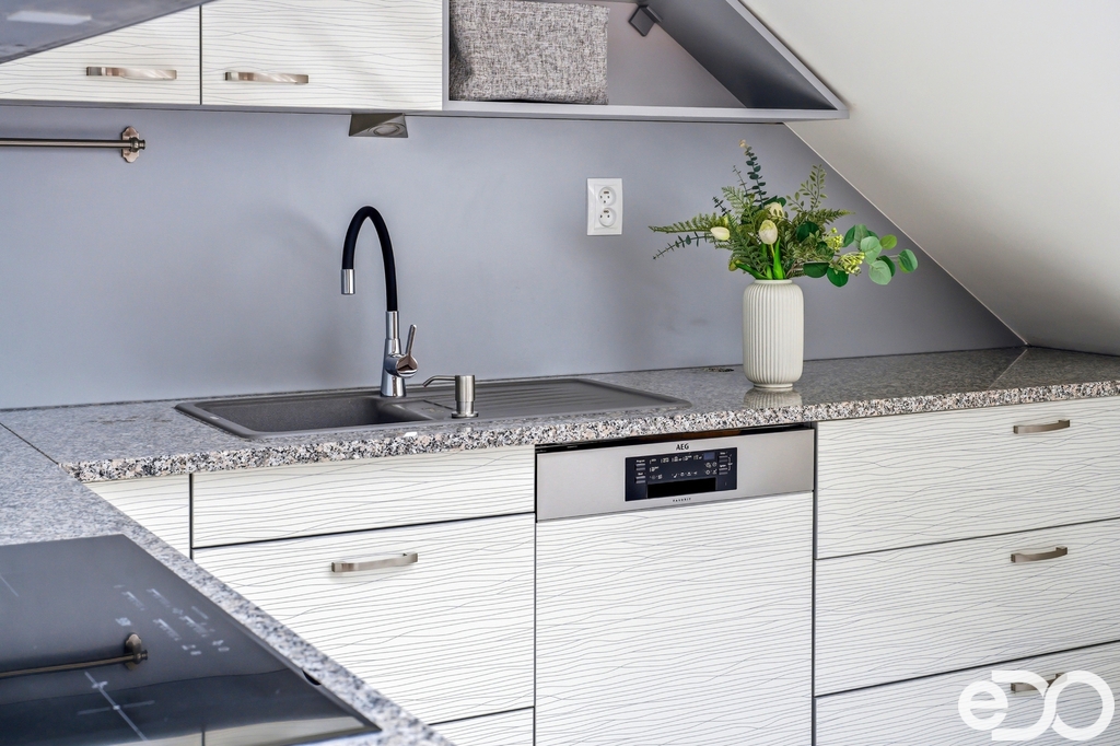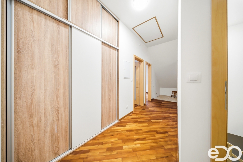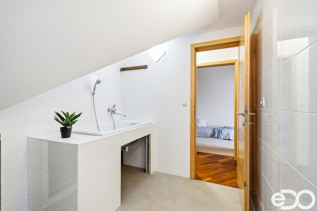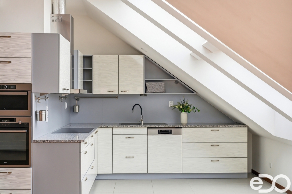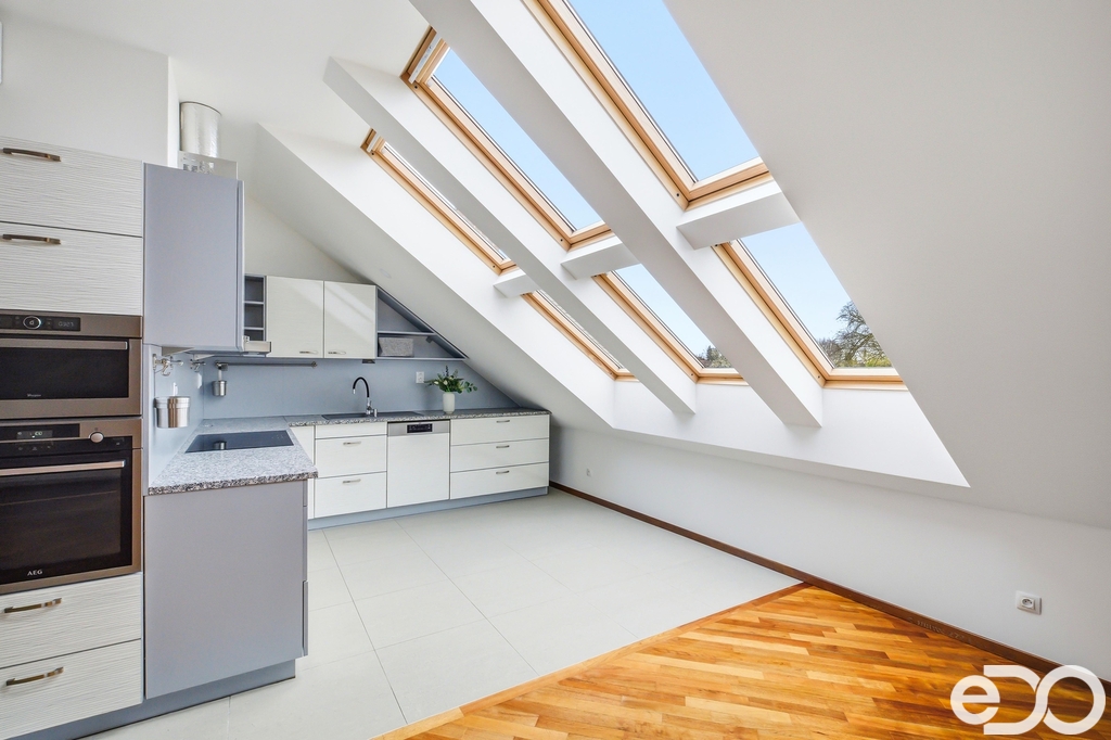 2NP – Bytová jednotka 4+kk se třemi ložnicemi, koupelnou, prádelnou, nedokončenou druhou koupelnou a kuchyní z roku 2018 s žulovou pracovní deskou, spotřebiči AEG a americkou lednicí. Podkroví nabízí dostatek světla i velkorysé rozměry místností.